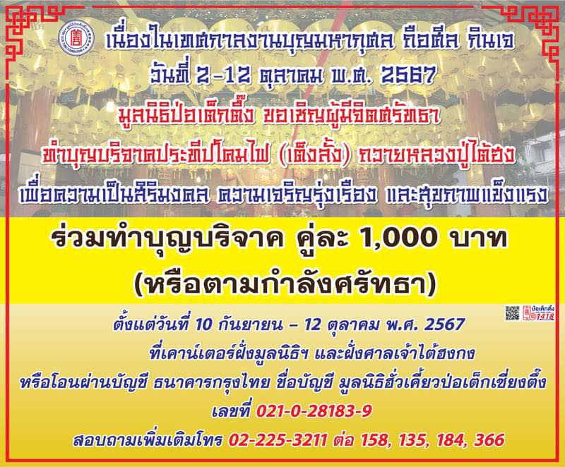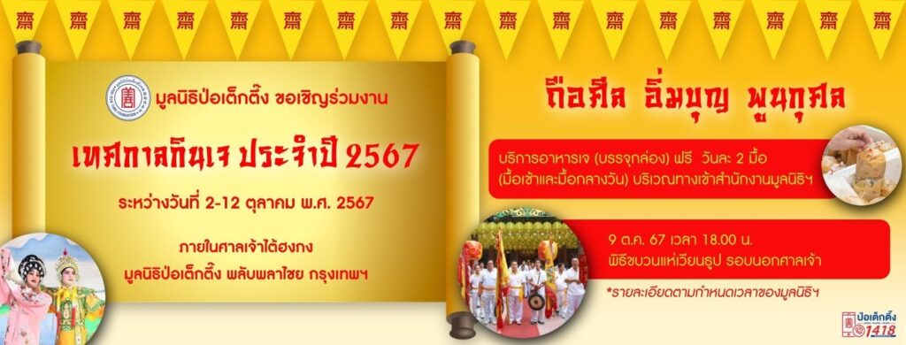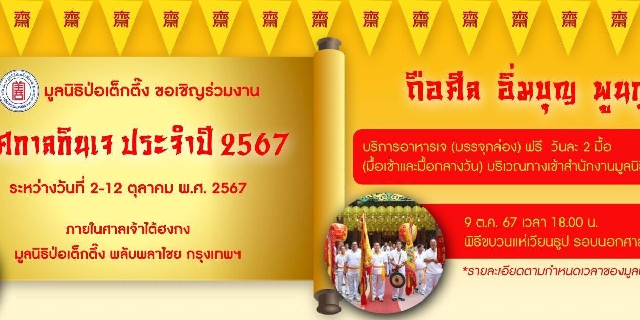 โดยในช่วงวันที่ 2-11 ตุลาคม 2567 มูลนิธิป่อเต็กตึ๊ง จัดให้มีบริการอาหารเจ [ในรูปแบบบรรจุกล่องกลับบ้าน] แก่ประชาชนฟรี วันละ 2 มื้อ (เช้า และ กลางวัน) โดยเริ่มบริการตั้งแต่มื้อเที่ยงของวันที่ 2 ตุลาคม 2567 เป็นต้นไป นอกจากนี้ ระหว่างวันที่ 1 – 12 ตุลาคม 67 ขอเชิญชวนประชาชนชมอุปรากรจีน (งิ้ว) ที่คณะลูกศิษย์หลวงปู่ไต้ฮงจัดถวายรวม 12 คืน