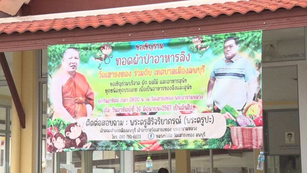 ที่ วัดเสาธงทอง พระอารามหลวง ตำบลท่าหิน อำเภอเมืองลพบุรี จังหวัดลพบุรี พระครูสิริจริยาภรณ์ เจ้าคณะอำเภอเมืองลพบุรี เจ้าอาวาสวัดเสาธงทอง พระอารามหลวง ร่วมกับเทศบาลเมืองลพบุรี และผู้มีใจรักลิง จัดทอดผ้าป่าอาหารลิง โดยมีพ่อค้าประชาชนผู้ที่มีใจรักลิง ทยอยนำอาหารประเภท ผัก ผลไม้ นานาชนิดมาถวายให้กับคณะสงฆ์กันอย่างคึกคัก โดยมีพระลูกวัด และลูกศิษย์ ที่ได้ร่วมกันคัดแยกอาหารที่ได้จากพ่อค้า แม่ค้า และประชาชนทั่วไป ออกเป็นชุด จำนวน 5 ชุด ตามกรงลิงที่มีอยู่ในสถานอนุบาลสัตว์เทศบาลเมืองลพบุรี จนถึงเวลา 09.00 น. ได้เริ่มพิธีทอดผ้าป่า หลังเสร็จพิธี ได้ร่วมกันตั้งขบวนขนย้ายผัก ผลไม้ จากการทอดผ้าป่า ขึ้นรถนำอาหารลิงออกจากวัดเสาธงทอง พระอารามหลวง เดินทางไปยังสถานอนุบาลสัตว์เทศบาลเมืองลพบุรี ตำบลโพธิ์เก้าต้น ระยะทางประมาณ 2 กิโลเมตร เมื่อไปถึงก็ได้ร่วมกันนำผัก ผลไม้ที่ได้ เลี้ยงลิง โดยได้แบ่งแยกให้ครบ 5 กรง จำนวนลิงกว่า 1,800 ตัว ให้ได้รับอาหารเท่าเทียมกัน อย่างครบถ้วน