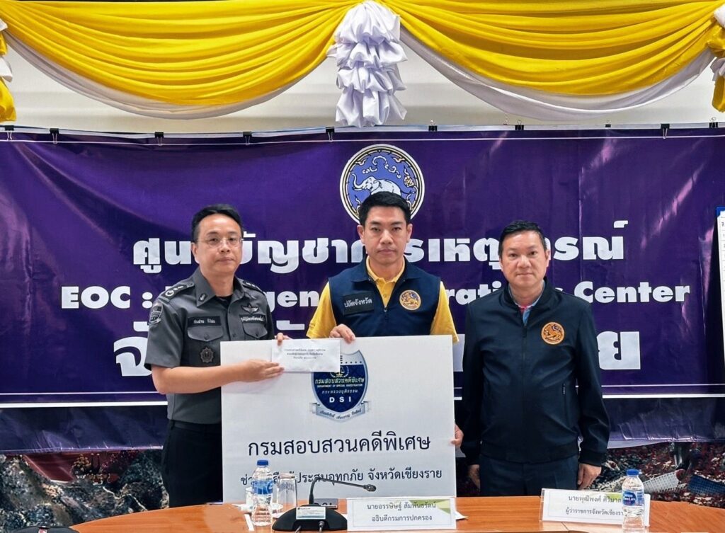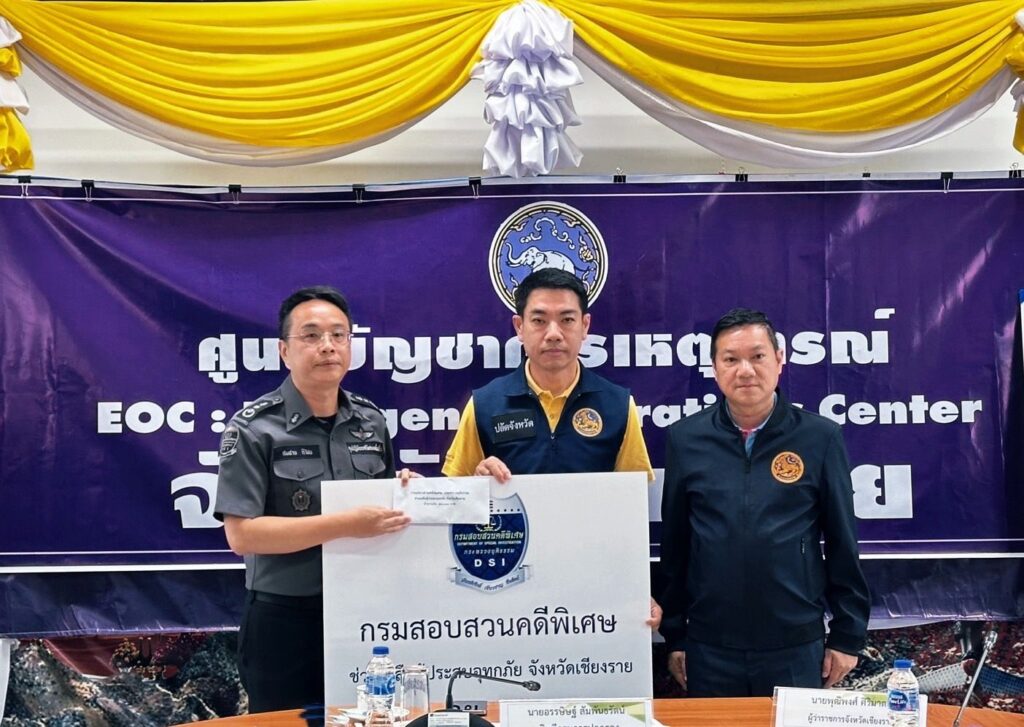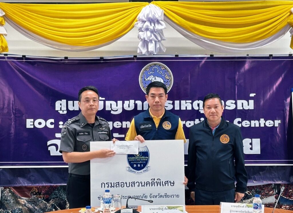 เมื่อวันพฤหัสบดีที่ 26 กันยายน 2567 : พันตำรวจตรี ยุทธนา แพรดำ รักษาราชการแทนอธิบดีกรมสอบสวนคดีพิเศษ มอบหมายให้ นายสมชาย ติไชย ผู้อำนวยการศูนย์ปฏิบัติการคดีพิเศษ เขตพื้นที่ 5 เป็นผู้แทนกรมสอบสวนคดีพิเศษ นำเงินบริจาคและสิ่งของเครื่องใช้ ที่บุคลากรกรมสอบสวนคดีพิเศษได้ร่วมใจกันบริจาค เพื่อช่วยเหลือผู้ประสบอุทกภัยในพื้นที่ภาคเหนือ ส่งมอบให้กับ นายบัลลังก์ ไวทย์ศิริ ปลัดจังหวัดเชียงราย เป็นตัวแทนผู้รับมอบเงินบริจาค ทั้งนี้ โดยมี นายอรรษิษฐ์ สัมพันธรัตน์ อธิบดีกรมการปกครอง พร้อมด้วยหัวหน้าส่วนราชการจังหวัดเชียงราย ร่วมเป็นสักขีพยานและขอบคุณ