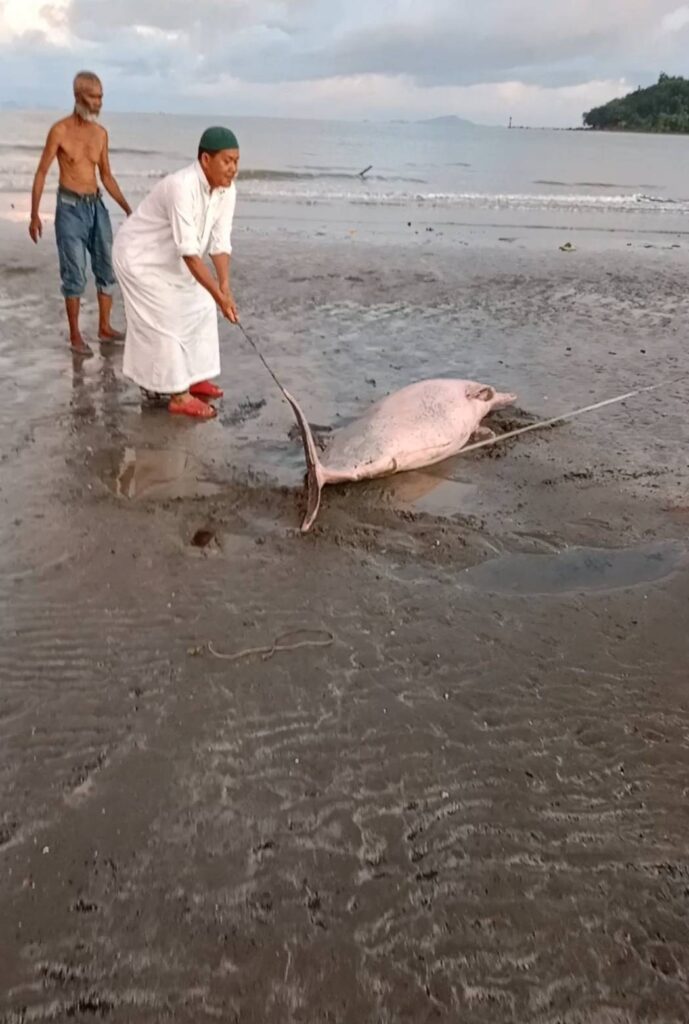 นาทีชีวิตน้องโลมาสีชมพู รอดหวุดหวิด หลังเกยหาดบ้านแหลมสน ตำบลแหลมสน อำเภอละงู จังหวัดสตูล ในช่วงเช้ามืดที่ผ่านมา (30 ก.ย.2567) หลังมีชาวบ้านออกมาหาหอยริมชายหาดในช่วงเช้ามืดกลับพบเห็นน้องโลมาสีชมพู มีขนาดตัวใหญ่ไม่น้อยกว่า 150 กิโลกรัม ลำตัวมีสีชมพู ที่คลีบมีบาดแผลเล็กน้อย นอนเกยหาดดังกล่าว หลังน้ำทะเลลดลงไปมากด้วยความตกใจจึงรีบวิ่งไปบอกชาวบ้านและผู้ช่วยผู้ใหญ่บ้านมาช่วยกันนำลงน้ำ ทันใดนั้นนายสมบัตร สันมาแอ ผู้ช่วยผู้ใหญ่บ้านบูโบย หมู่ที่ 3 ที่อยู่บริเวณนั้นพอดีจึงรีบเกณฑ์คน 4-5 คนไปช่วยนำน้องโลมาสีชมพูลงน้ำด้วยความที่กลัวมันจะตาย จึงหาเชือกบริเวณใกล้ ๆ ลากน้องโลมารีบลงน้ำทะเล หลังพบว่าน้ำในบริเวณนั้นลดมานานกว่า 3 ชั่วโมงแล้ว ด้วยกลัวว่าจะตายจึงรีบช่วยกัน ใช้เวลาประมาณ 20 นาทีก็ช่วยลงน้ำทะเลลึกที่พอจะว่ายกลับไปสู่ทะเลกว้างได้สำเร็จ