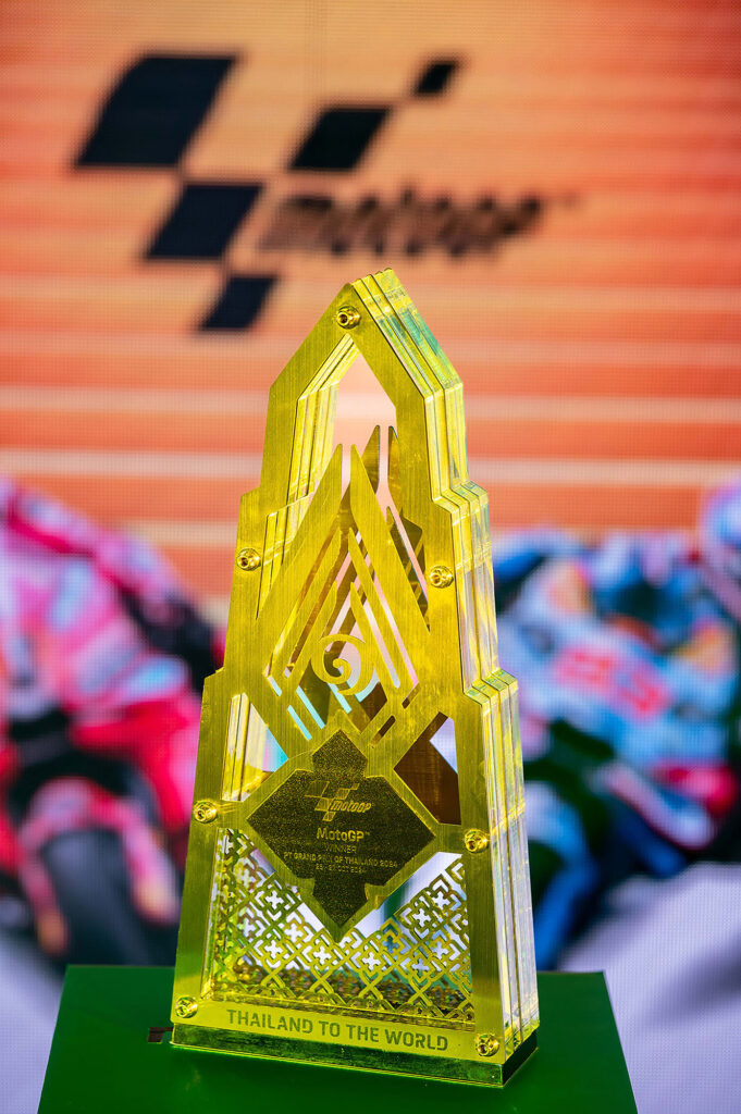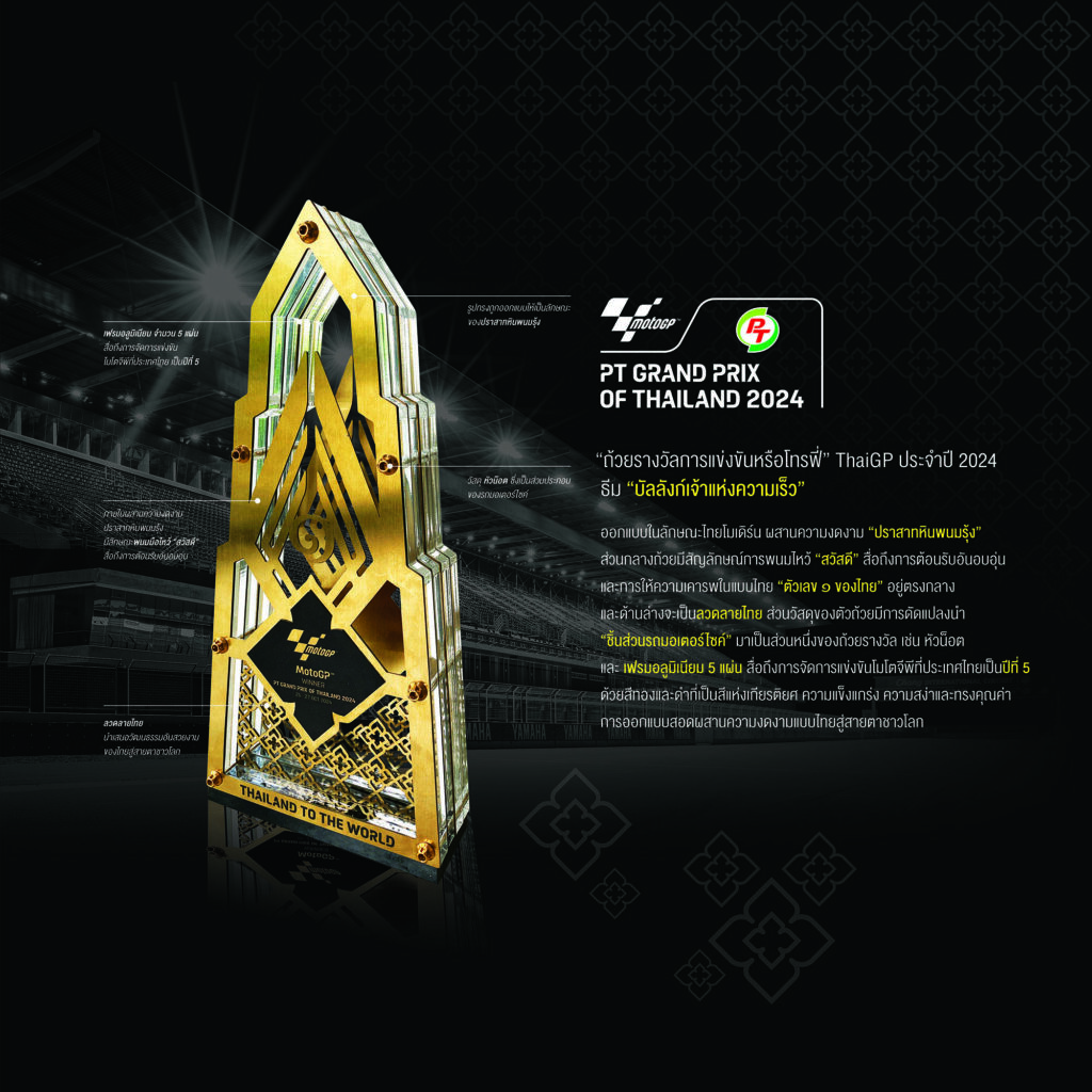 พร้อมกันนี้ยังได้เปิดตัว “ถ้วยรางวัลการแข่งขันหรือโทรฟี่” ThaiGP ประจำปี 2024 ด้วยธีม “บัลลังก์เจ้าแห่งความเร็ว” ลักษณะไทยโมเดิร์น ผสานความงดงาม “ปราสาทหินพนมรุ้ง” ส่วนกลางถ้วยมีสัญลักษณ์การพนมไหว้ “สวัสดี” สื่อถึงการต้อนรับอันอบอุ่นและการให้ความเคารพในแบบไทย “ตัวเลข ๑ ของไทย” อยู่ตรงกลางและด้านล่างจะเป็นลวดลายไทย ส่วนวัสดุของตัวถ้วยมีการดัดแปลงนำ “ชิ้นส่วนรถมอเตอร์ไซค์” มาเป็นส่วนหนึ่งของถ้วยรางวัล เช่น ตัวน็อต และ เฟรมอลูมิเนียม 5 แผ่น สื่อถึงการจัดการแข่งขันโมโตจีพีที่ประเทศไทยเป็นปีที่ 5 ด้วยสีทองและดำที่เป็นสีแห่งเกียรติยศ ความแข็งแกร่ง ความสง่าและทรงคุณค่า การออกแบบสอดผสานความงดงามแบบไทยสู่สายตาชาวโลก