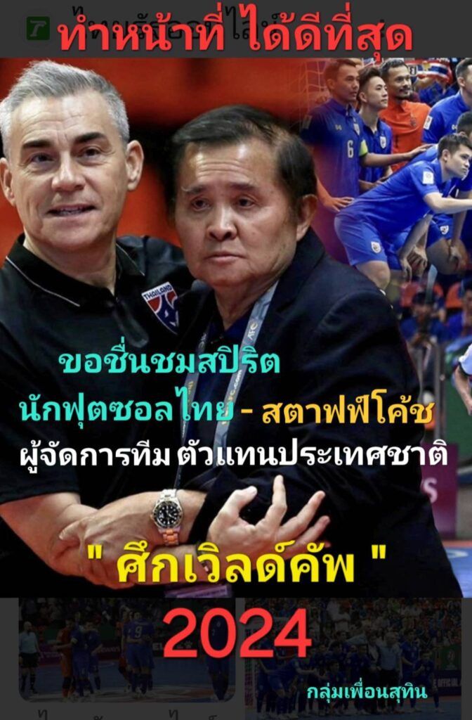 “ผมในนามของผู้จัดการทีมฟุตซอลทีมชาติไทย ต้องขอขอบคุณ คุณทศพล-คุณวรีพร ตันติวงษ์ ประธานบริหารบริษัท สงวนวงษ์อุตสาหกรรม จํากัด ซึ่งเป็นอุตสาหกรรมแป้งมันที่ใหญ่ที่สุดในเอเชียที่ตั้งอยู่ที่ จ.นครราชสีมา,ขอบคุณ คุณธีรัถต์ สุทธิสัมพัทน์ รอง ปธ บริษัทยูไนเต็ดฟู้ดส์ จำกัด (มหาชน),คณะเพื่อนและผู้บริหารกลุ่มภูเก็ต,”นายกหลี” ร.ต.อ.สุปชัย อินทรักษา อดีตนายกเทศมนตรี และนายกเทศมนตรี ตำบลปรุใหญ่ อ.เมือง จ.นครราชสีมา ที่้ร่วมกันมอบโบนัสให้กับทีมฟุตซอลทีมชาติไทยในฟุตซอลโลก2024″