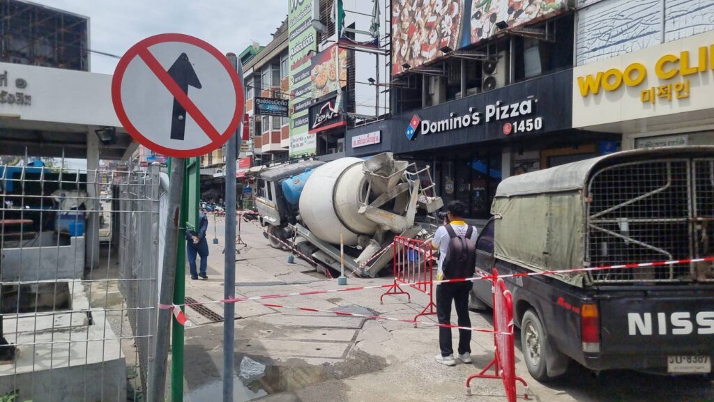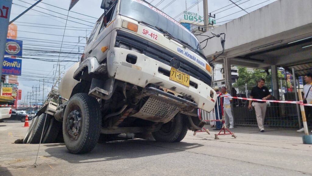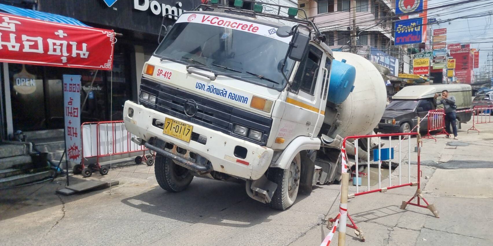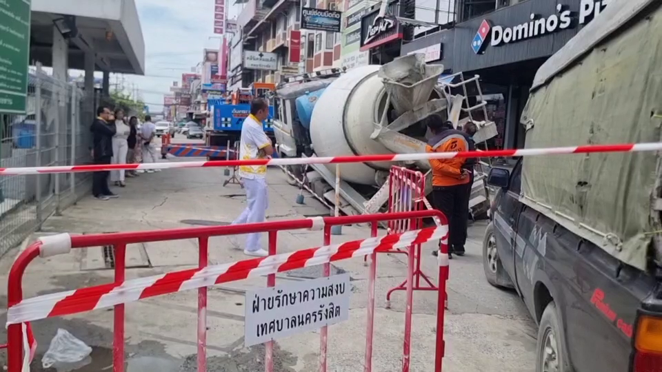เมื่อเวลา 12.00.น.วันที่ 3 ต.ค. 67 ร.ต.อ.นพพร แสงสว่าง ร้อยเวรสอบสวน สภ.ประตูน้ำจุฬาลงกรณ์ อ.ธัญบุรี จ.ปทุมธานี ได้รับแจ้งจาก ร.ต.อ.ดร.ตรีลุพธ์ ธูปกระจ่าง นายกเทศมนตรีนครรังสิต ว่ามีรถบรรทุกปูน วิ่งเข้ามาในหมู่บ้านรัตนโกสินทร์ 200 ปี ซอยรังสิตปทุมธานี 10 ทำให้ถนนทรุดตัวเป็นหลุมกว้าง จึงไปตรวจสอบที่เกิดเหตุ พบรถบรรทุกปูน 10ล้อทะเบียน 70-0117 นนทบุรี ของ บริษัทสปีคพลัส คอมเทค สภาพล้อหลังด้านซ้ายจมลงไปในหลุมถนนทรุดตัวขนาดใหญ่