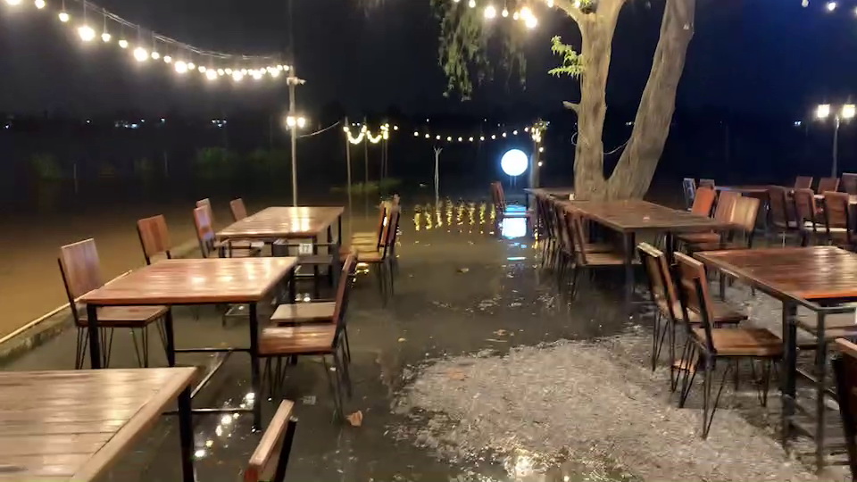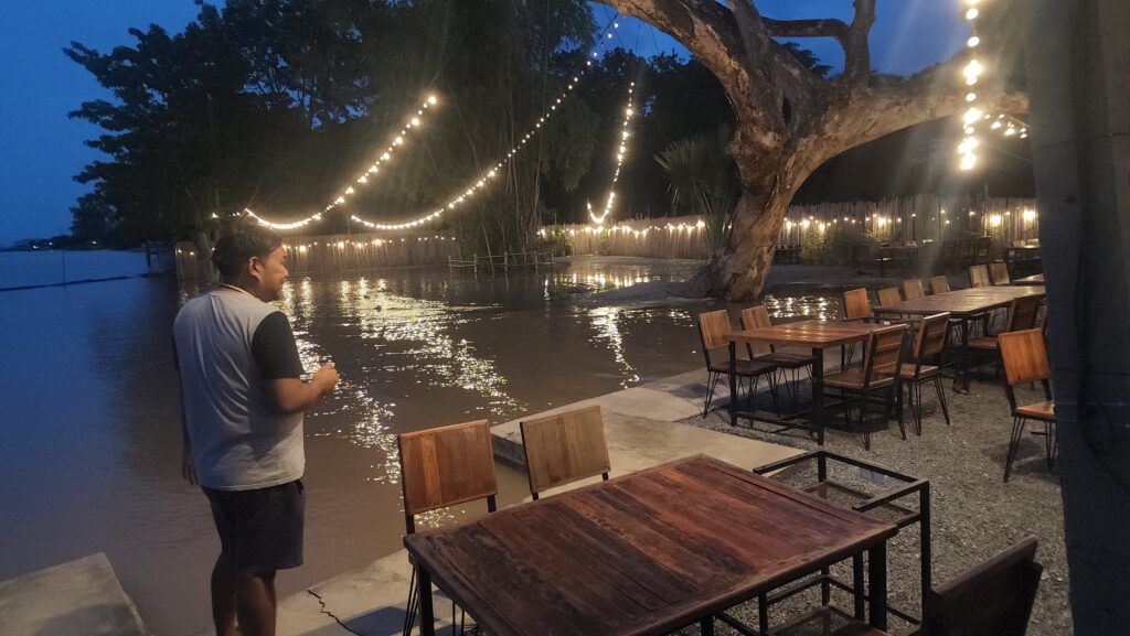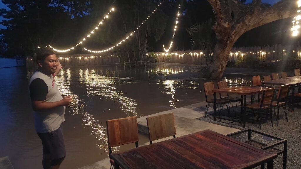 จากการสอบถาม นายธนะชัย ทองคำ เจ้าของร้านฯ กล่าวว่า ตั้งแต่ 6 โมงเย็นน้ำจะเริ่มขึ้นแล้ว โดยจะขึ้นประมาณ 4 – 5 ทุ่ม จะค่อยๆ ลง จนถึง 6 โมงเช้า น้ำจะทรงตัว และช่วงเย็นก็จะเริ่มขึ้นอีก โดยน้ำจะขึ้นมาถึงบริเวณโซนที่ 1 ของร้าน ส่วนโซนที่ 2 ของร้านจมหมดแล้ว แต่น้ำจะขึ้นๆ ลงๆ เพราะฝั่งนั้นจะต่ำกว่าโซน 1 ประมาณ 10 เซนติเมตร ทางร้านเราได้รับผลกระทบจากน้ำเอ่อล้นริมตลิ่งเมื่อวันที่ 30 สิงหาคมที่ผ่านมา หลังจากโพสคลิปบรรยากาศร้านที่ถูกน้ำท่วมลูกค้าก็ชื่นชอบ แต่เราก็ต้องประเมินสถานการณ์วันต่อวัน และติดตามข่าวสารตลอด ดูว่าน้ำจะขึ้นมากกว่านี้หรือไม่ หากพบว่าน้ำขึ้นมากกว่าปกติแต่ไม่ลงก็ต้องเตรียมยกของขึ้นที่สูง ปีที่พ้นมาน้ำไม่ท่วม ซึ่งทางร้านได้รับผลกระทบหนักเลยคือ ปี64 และ ปี65 น้ำท่วมเยอะ.
