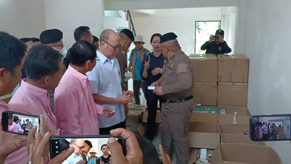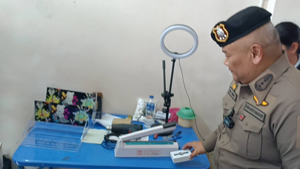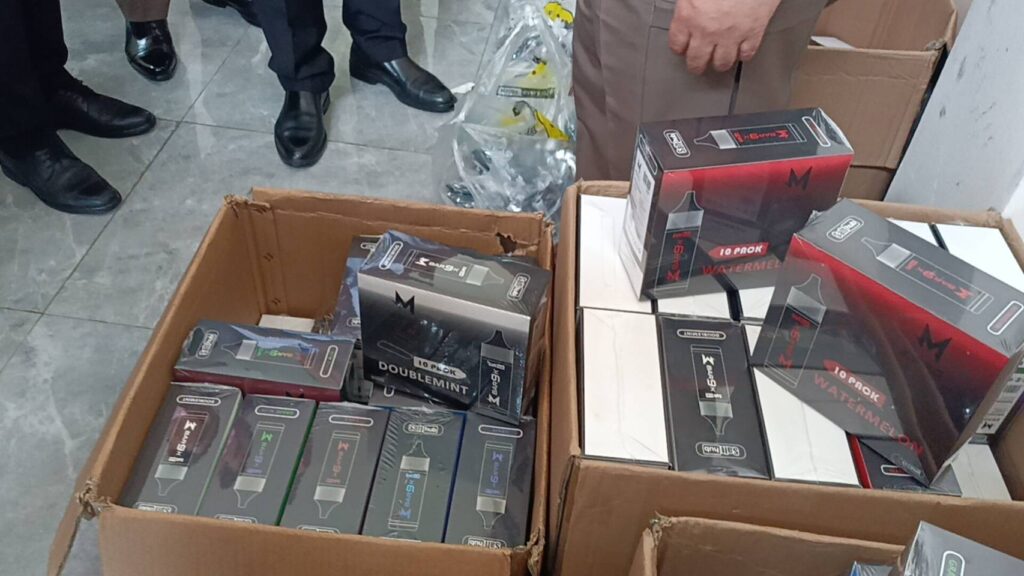 พร้อมตรวจยึดของกลางคือ บุหรี่ไฟฟ้าแบบบรรจุกล่องสำเร็จรูป ใช้แล้วทิ้ง 700 ชิ้น ลังบรรจุภัณฑ์ (กล่องเปล่า) เครื่องบุหรี่ไฟฟ้ารอบรรจุลงกล่อง 3,000 ชิ้น หัวพอทน้ำยาบุหรี่ไฟฟ้ารอบรรจุจำนวน 870 ชิ้น เครื่องบุหรี่ไฟฟ้าพร้อมหัวพอร์ตบรรจุแล้วจำนวน 300 กล่อง เครื่องซีล และอุปกรณ์การไลฟ์สด มูลค่าของกลางรวมจำนวนทั้งสิ้น 4,870 ชิ้น ราคารวม 1,920,000 บาท