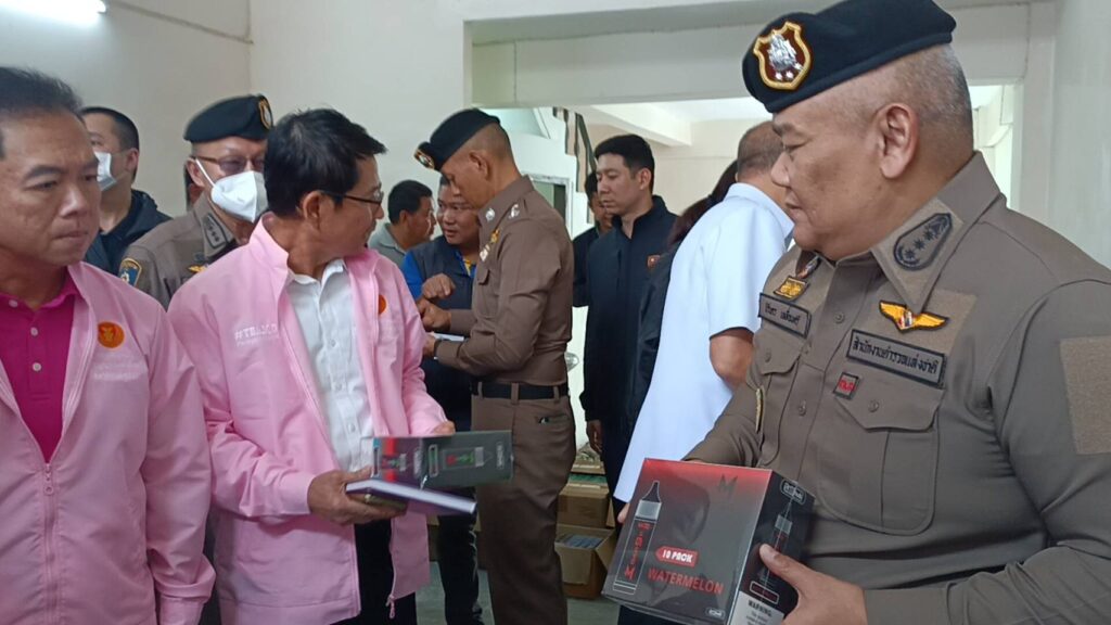 พล.ต.ท.นิรันดร เหลื่อมศรี ผู้ช่วย ผบ.ตร. เปิดเผยว่า การจับกุมครั้งนี้แม้จะได้ของกลางจำนวนไม่มาก แต่ถือว่าเป็นการทลายเครือข่ายจีนเทาที่เข้ามาประกอบธุรกิจผิดกฏหมายในไทย ซึ่งครั้งนี้สามารถจับกุมผู้ต้องหาชาวจีนได้ โดยเจ้าหน้าที่ตำรวจมีข้อมูลว่าผู้ต้องหารายนี้เดินทางเข้าออกประเทศไทย เพื่อดูแลขบวนการขนบุหรี่ไฟฟ้ามาแล้วนับสิบครั้ง และเชื่อว่าก่อนหน้านี้ของกลางที่เก็บไว้ในอาคารพาณิชย์หลังนี้ น่าจะมีจำนวนที่มากกว่านี้ โดยเครือข่ายบุหรี่ไฟฟ้าที่จับได้ครั้งนี้ มีการจำหน่ายผ่านสื่อออนไลน์ ในลักษณะของการไลฟ์สด โดยมีกลุ่มเป้าหมายเป็นเด็กนักเรียน เนื่องจากของกลางที่ตรวจพบนั้น มีลักษณะเฉพาะทั้งขนาดและลวดลายสีสัน ที่ดึงดูดเด็กในวัยเรียน