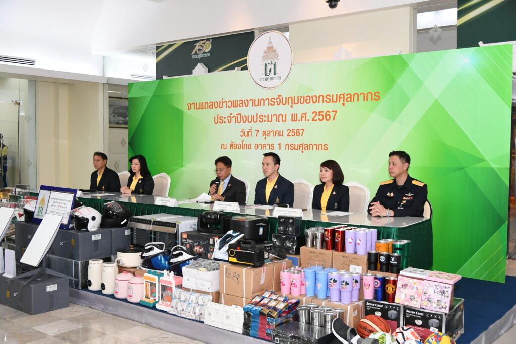 วันที่ 7 ตุลาคม 2567 เวลา 15.00 น. นายธีรัชย์ อัตนวานิช อธิบดีกรมศุลกากร พร้อมด้วยนายพันธ์ทอง ลอยกุลนันท์ ที่ปรึกษาด้านการพัฒนาและบริหารการจัดเก็บภาษี นางนันท์ฐิตา ศิริคุปต์ ที่ปรึกษาด้านพัฒนาระบบควบคุมทางศุลกากร นางกิจจาลักษณ์ ศรีนุชศาสตร์ ที่ปรึกษาด้านพัฒนาระบบสิทธิประโยชน์ทางศุลกากร นายยุทธนา พูลพิพัฒน์ รองอธิบดีกรมศุลกากร นายนิติ วิทยาเต็ม รองอธิบดีกรมศุลกากร คณะทำงานโฆษกกรมศุลกากร และคณะผู้บริหารกรมศุลกากร ร่วมแถลงผลการจับกุมการกระทำความผิดในการลักลอบนำเข้าและส่งออกสินค้า ตามนโยบายรัฐบาล ประจำปีงบประมาณ พ.ศ.2567 อาทิ ยาเสพติด บุหรี่ บุหรี่ไฟฟ้า อุปกรณ์บุหรี่ไฟฟ้า น้ำยาบุหรี่ไฟฟ้า สินค้าที่ไม่มีใบอนุญาต สินค้าละเมิดทรัพย์สินทางปัญญา โดยมีมูลค่ากว่า 2,607.36 ล้านบาท ณ ห้องโถง อาคาร 1 ชั้น 1 กรมศุลกากร (คลองเตย)