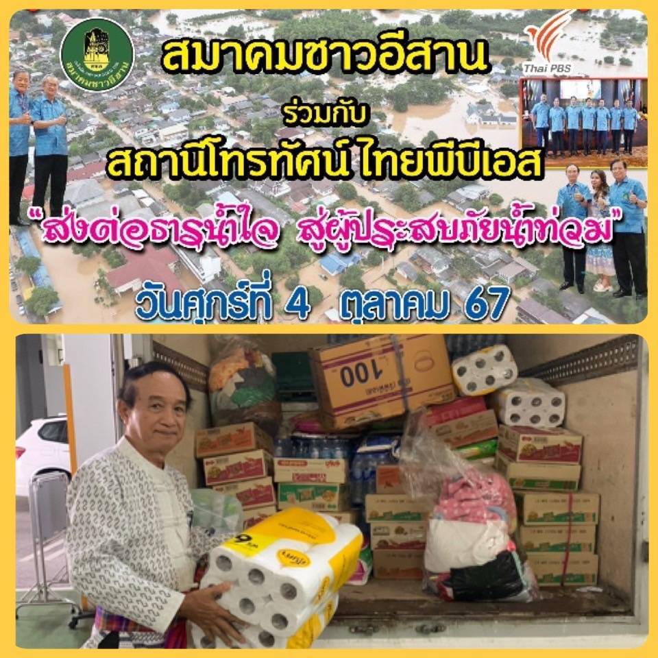 สมาคมชาวอีสาน ผนึกพลังร่วมกับ สถานีโทรทัศน์ไทยพีบีเอส (วิภาวดีรังสิต) ทำพิธี ส่งธารน้ำใจ สู่ผู้ประสบภัยน้ำท่วม เมื่อวันที่ 4 ตุลาคม 2567 โดย สมาคมชาวอีสาน มี พล.อ.ต.ณัฏฐอรรจน์ ถวิลหวัง,พล.ท.จารุมาศ เรืองสุวรรณ,ศ.ดร. ฐาปนา บุญหล้า,ดร.สมศักดิ์ มีเสถียร