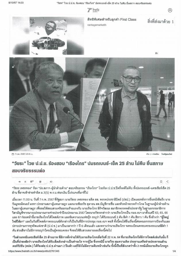 เมื่อวันที่ 8 ตุลาคม 2567 นายวัชระ เพชรทอง อดีต สส.พรรคประชาธิปัตย์ เปิดเผยกับผู้สื่อข่าวว่า “ตามที่สื่อมวลชนได้นำเสนอข่าวนายเรืองไกร ลีกิจวัฒนะ เมื่อครั้งดำรงตำแหน่งกรรมาธิการวิสามัญพิจารณางบประมาณรายจ่ายประจำปีงบประมาณ ๒๕๖๗ และกรรมธิการงบประมาณฯ ตั้งแต่ปี ๒๕๖๓ ปี ๒๕๖๕ – ๒๕๖๖ ได้โพสต์ภาพและข้อความบนเฟซบุ๊กระบุว่าได้รับรถเบนซ์ ๒ คัน สีดำ ๑ คัน สีขาว ๑ คัน ซึ่งอ้างว่า “ผู้ใหญ่ใจดีให้มา” และโพสต์ภาพแคชเชียร์เช็ค ๒๕ ล้านบาท ที่มีการสั่งจ่ายให้กับนายเรืองไกรเมื่อวันที่ ๒๒ กุมภาพันธ์ ๒๕๖๔ ภายหลังนายเรืองไกรฯ ทำไขสือไม่เข้าใจสถานะของตนเองว่าเป็นเจ้าพนักงานของรัฐและกล่าวอ้างลอย ๆ ผ่านสื่อมวลชนต่าง ๆ ว่านางอโณทัย ลีกิจวัฒนะ ภรรยาเป็นคนซื้อรถเบนซ์ให้ ทั้งนี้เป็นที่น่าสงสัยว่านายเรืองไกรได้รับรถเบนซ์และแคชเชียร์เช็คดังกล่าวเป็นค่าอะไร จากผู้ใด