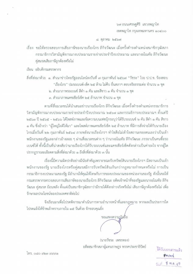 “…วัชระ ร้องอธิบดีกรมสรรพากร ขอให้ตรวจสอบการเสียภาษีของนายเรืองไกร ลีกิจวัฒนะ เมื่อครั้งดำรงตำแหน่งสมาชิกวุฒิสภากรรมาธิการวิสามัญพิจารณางบประมาณรายจ่ายประจำปีงบประมาณ และนางอโณทัย ลีกิจวัฒนะ คู่สมรสเสียภาษีถูกต้องหรือไม่…”
