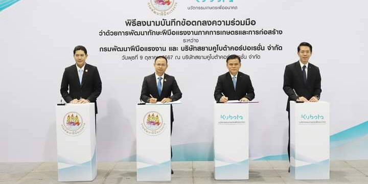 เมื่อวันที่ 9 ต.ค.67 เวลา 10.00 น. ที่บริษัทสยามคูโบต้าคอร์ปอเรชั่น จำกัด สำนักงานใหญ่ นิคมอุตสาหกรรมนวนคร อ.คลองหลวง จ.ปทุมธานี นายสมบัติ โพธิวัฒน์ ผู้ตรวจราชการกรมพัฒนาฝีมือแรงงาน และนายไวพจน์ หามาลา Head of Customer Solutions บริษัทสยามคูโบต้า คอร์ปอเรชั่น จำกัด เป็นผู้แทนในการลงนามบันทึกข้อตกลงความร่วมมือ (MOU) ว่าด้วยการพัฒนาทักษะฝีมือแรงงานภาคการเกษตรและการก่อสร้าง ระหว่างสองหน่วยงาน เพื่อร่วมกันพัฒนากำลังแรงงานให้มีทักษะฝีมือทันต่อการเปลี่ยนแปลงของเทคโนโลยี โดยจากการ MOU ทั้งสองหน่วยงานจะร่วมกันจัดทำมาตรฐานฝีมือแรงงานของผู้ประกอบอาชีพ และจัดฝึกอบรมหลักสูตรการขับขี่รถขุดมืออาชีพ ซึ่งมีระยะเวลาการฝึกอบรม 18 ชั่วโมง ในพื้นที่ 5 จังหวัด ได้แก่ อุบลราชธานี นครราชสีมา พระนครศรีอยุธยา กรุงเทพมหานคร และเชียงใหม่ มีเป้าหมายดำเนินการ 135 คน เพื่อให้ผู้เข้ารับการฝึกอบรมมีทักษะความชำนาญในการใช้งานเครื่องจักรกล สามารถนำความรู้และทักษะที่ได้รับไปใช้ในการประกอบอาชีพให้มีความมั่นคง อันจะนำไปสู่การส่งเสริมและการพัฒนาอาชีพให้มีความยั่งยืน