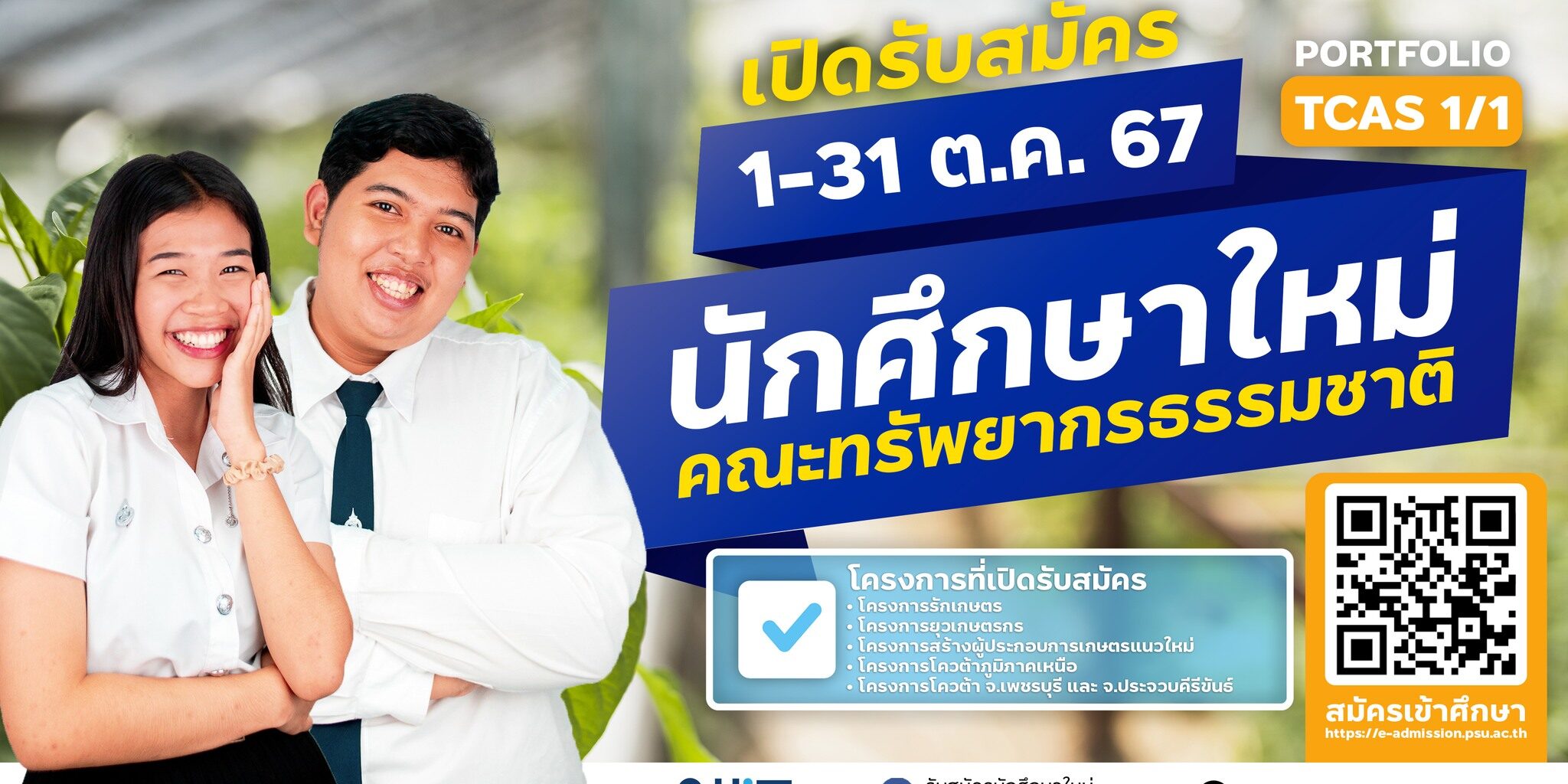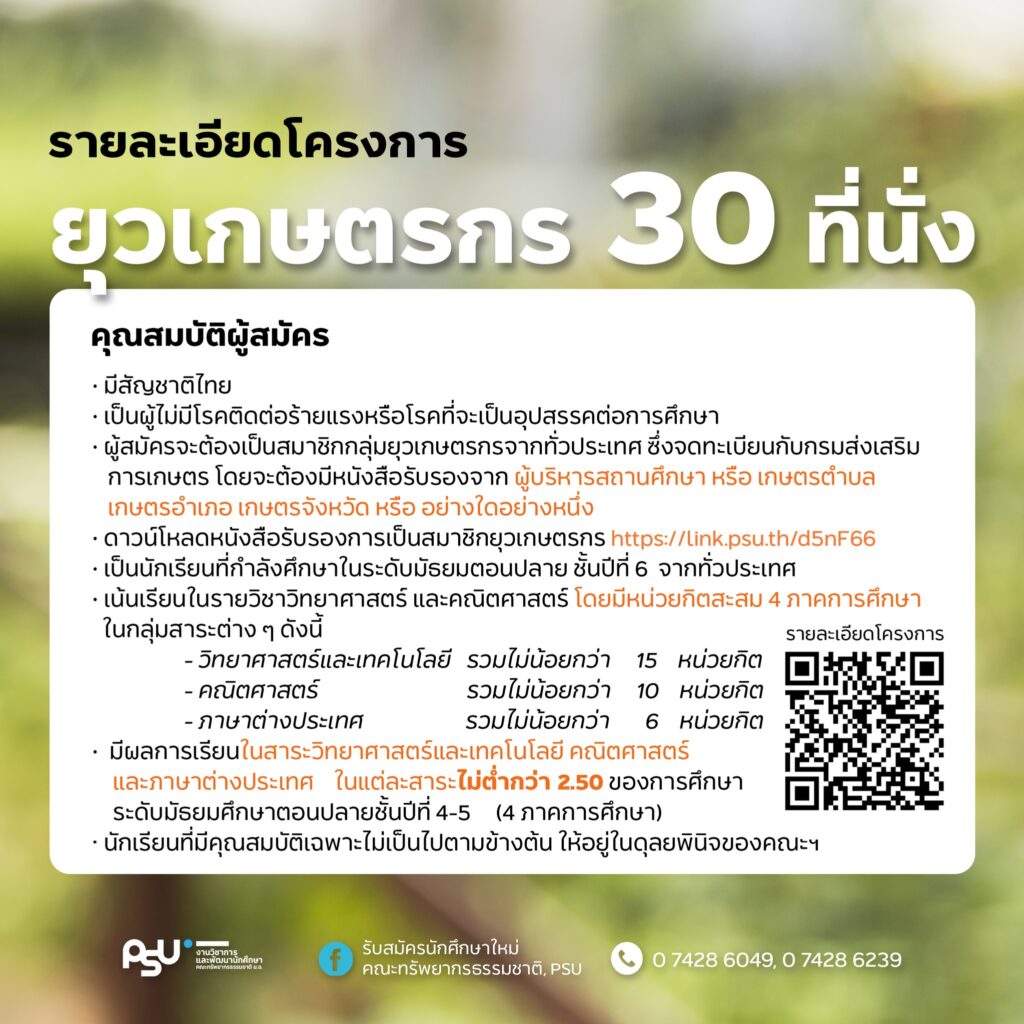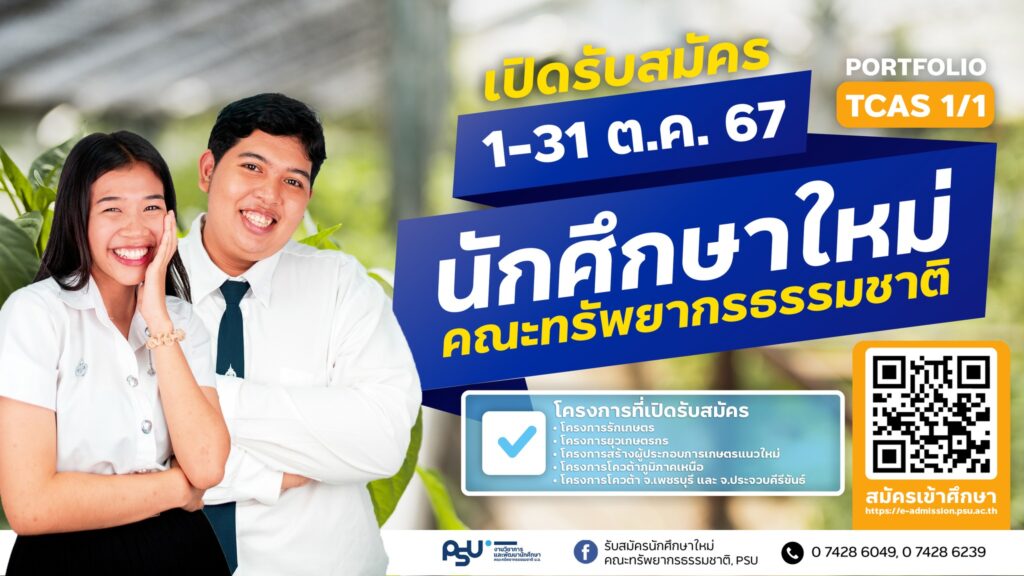 สำนักงานส่งเสริมและพัฒนาการเกษตรที่ 1 จังหวัดชัยนาท ขอประชาสัมพันธ์การเปิดรับสมัครคัดเลือกนักเรียนที่เป็นยุวเกษตรกร เพื่อเข้ารับการศึกษาต่อในระดับปริญญาตรี ประจำปีการศึกษา 2568 คณะทรัพยากรธรรมชาติ มหาวิทยาลัยสงขลานครินทร์ วิทยาเขตหาดใหญ่