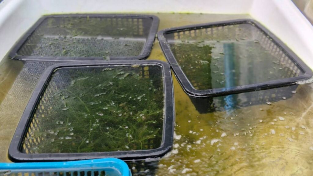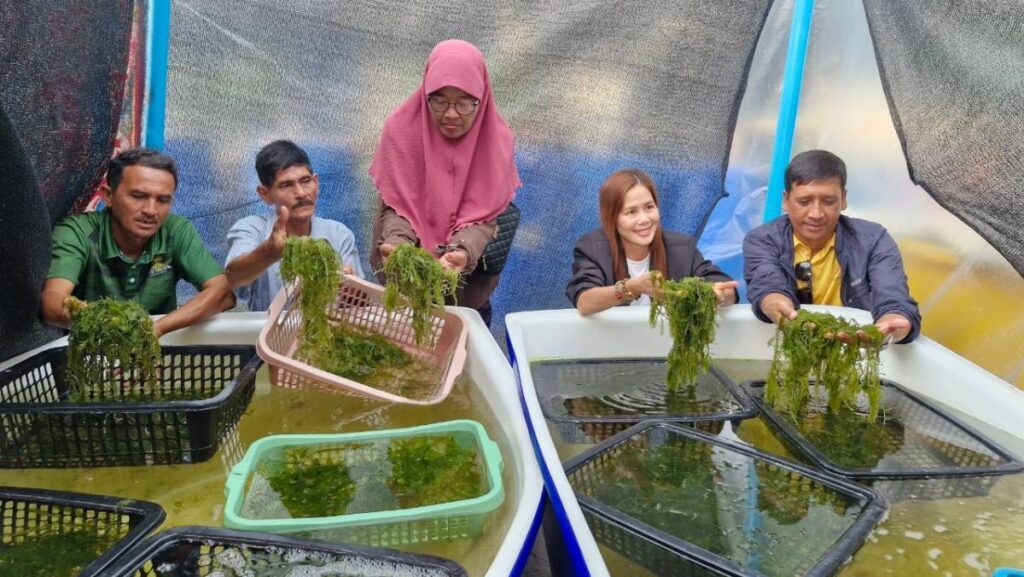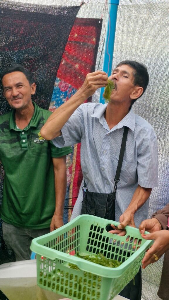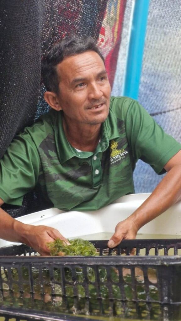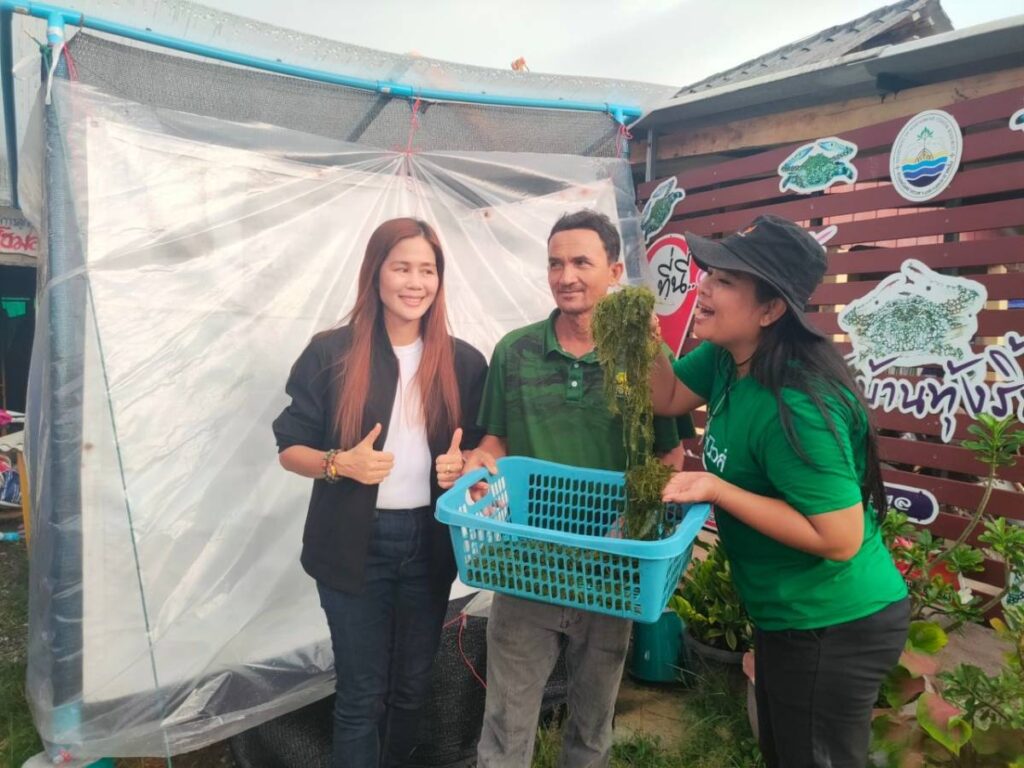 ผู้ใหญ่บ้านหมู่ที่ 1 (ปธ.ศูนย์เรียนรู้ธนาคารปูม้าบ้านทุ่งริ้น) บอกด้วยว่า จากนั้นได้ทำต่อมาเรือย ๆ และมีการต่อยอดให้สมาชิกในกลุ่มมีรายได้เพิ่มจนเป็นที่มาของโครงการเพาะเลี้ยงสาหร่ายขนนก โดยได้เล็งเห็นว่าตลาดน่าจะไปได้เพราะขายในพื้นที่ก็ไม่เพียงพอ อีกทั้งในธรรมชาติเริ่มหาน้อยเต็มที และยังหาทานยาก โดยข้อดีของการเพาะเลี้ยงพบว่าสาหร่ายไม่มีทราย หรือเศษดินปะปน เพียงแค่นำมาล้างและรับประทานได้เลย ถ้าเป็นสาหร่ายที่ขึ้นตามธรรมชาติจะมีเม็ดทรายปะปนและมีกลิ่นคาวของน้ำ แต่การเพาะเลี้ยงลักษณะนี้รับประทานได้อย่างอร่อย สามารถมีทานได้ตลอดทั้งปี อนาคตจะต่อยอดขยายให้กับสมาชิกเพิ่มอีก ดูแล้วทิศทางเป็นไปได้ โดยวันนี้เป็นเพียงตัวอย่างก็ได้รับการตอบรับอย่างดี เชื่อว่าจะเพิ่มช่องทางรายได้ให้กับชาวประมงพื้นบ้านได้เป็นอย่างดี