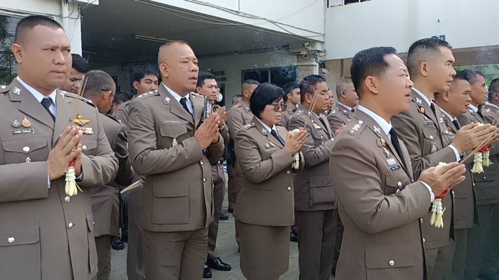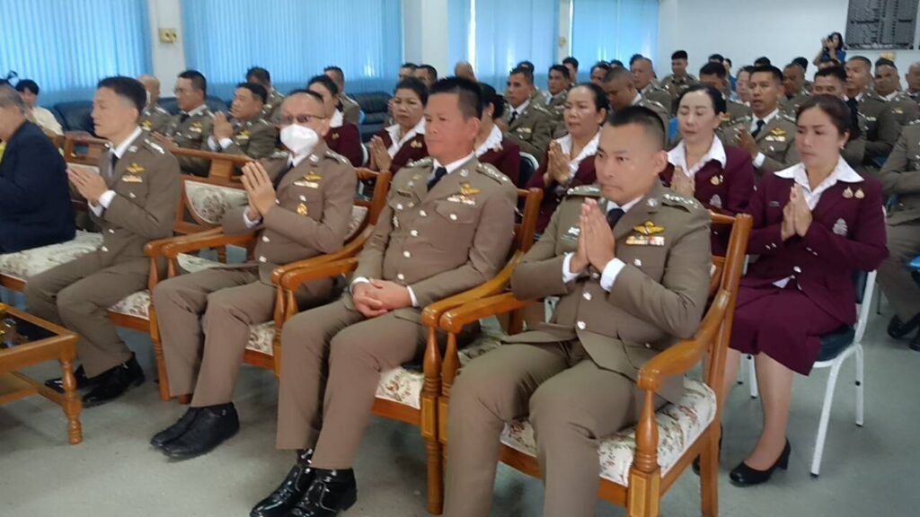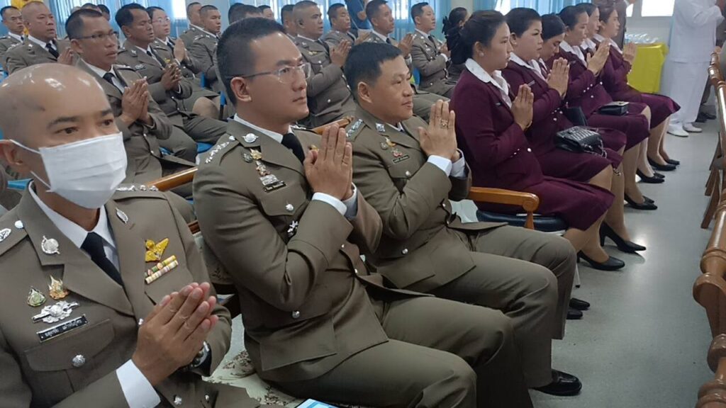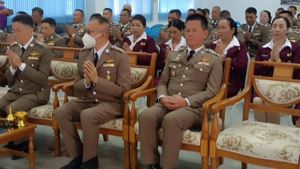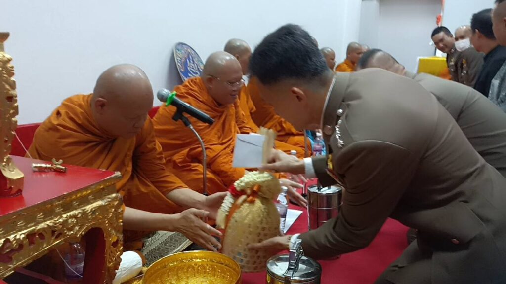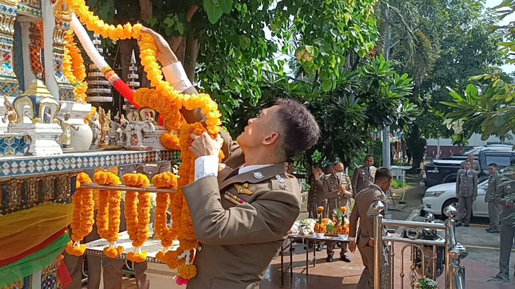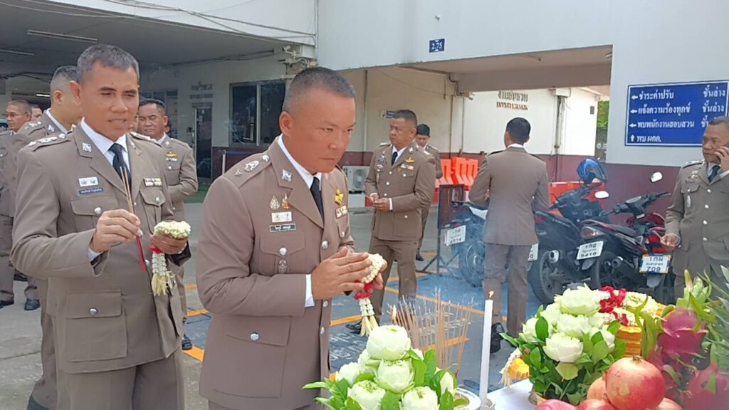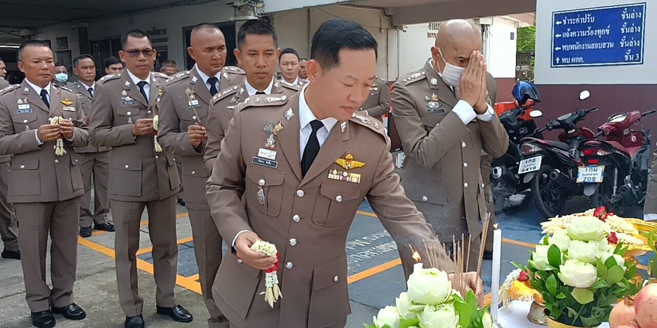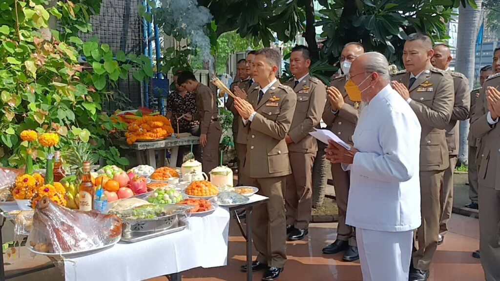 พ.ต.อ.ธีระเดช อธิภัคกุล รอง ผบก.ภ.จว.สมุทรสาคร พร้อมคณะข้าราชการตำรวจ ได้ร่วมสักการะพระพุทธวชิรปราการ และพระภูมิเจ้าที่ บริเวณด้านหน้าที่ทำการ จากนั้น ข้าราชการตำรวจ พร้อมด้วย คณะกรรมการ กต.ตร. และแม่บ้านตำรวจ ภ.จว.สมุทรสาคร ได้ร่วมกันประกอบพิธีสงฆ์ ณ ห้องประชุมชั้น 3 ภ.จว.สมุทรสาคร พร้อมกับถวายเครื่องไทย แด่พระภิกษุสงฆ์ วัดป้อมวิเชียรโชติการาม พระอารามหลวง