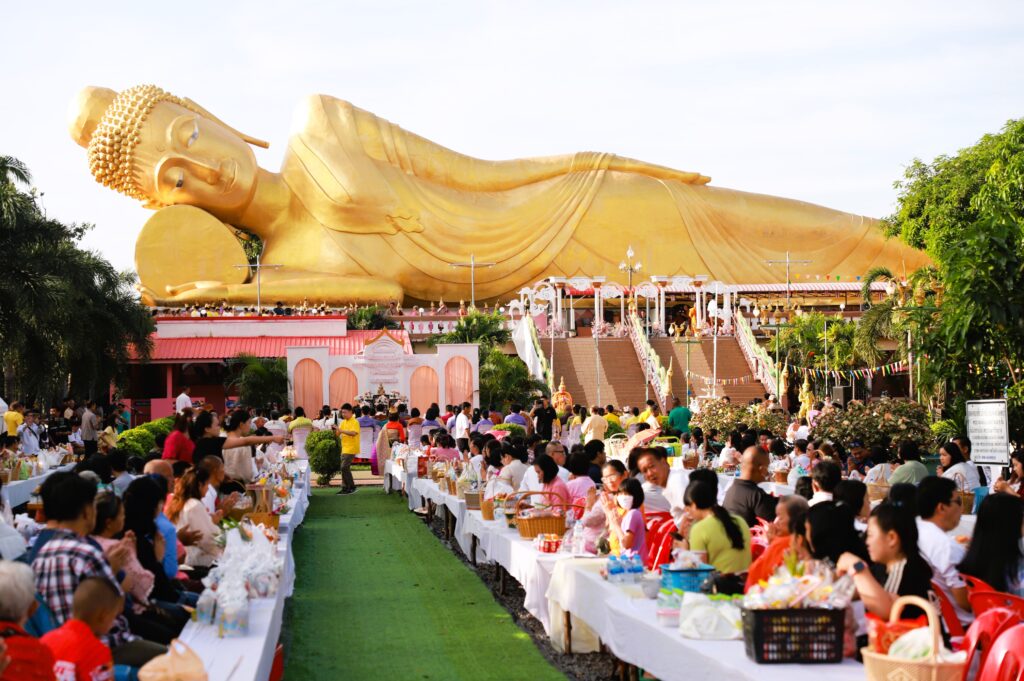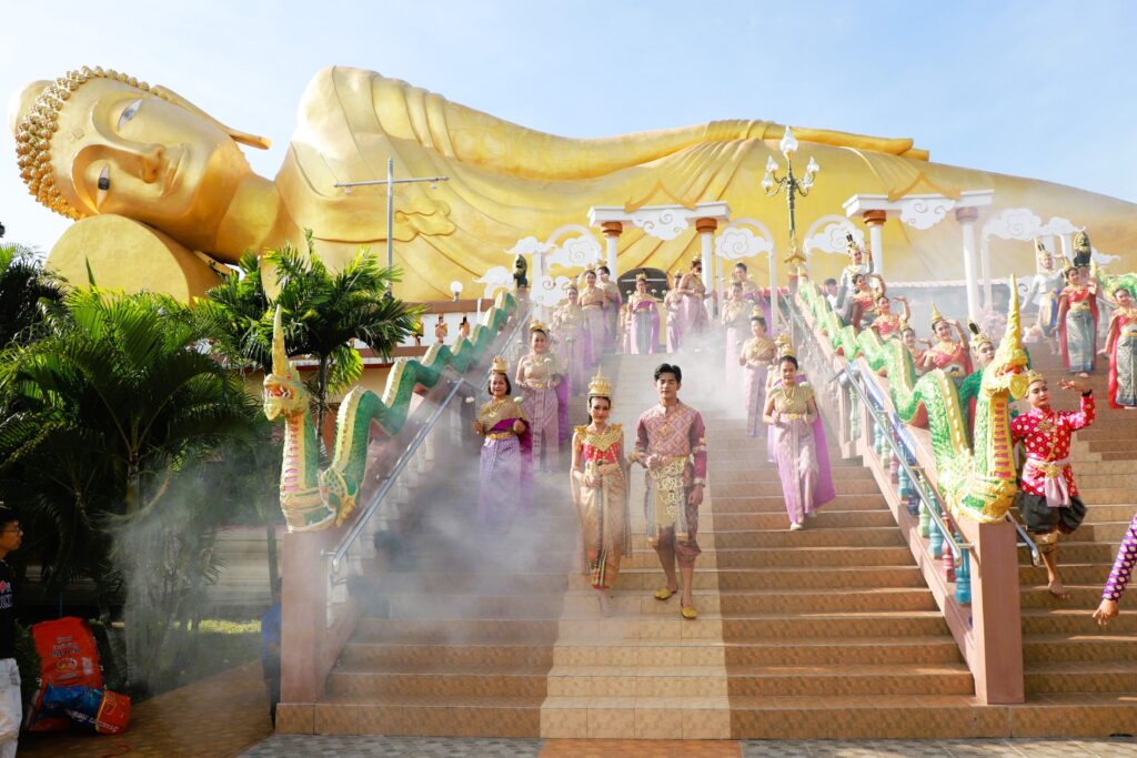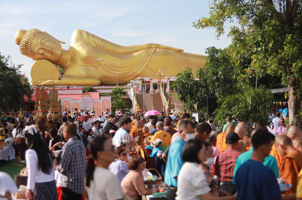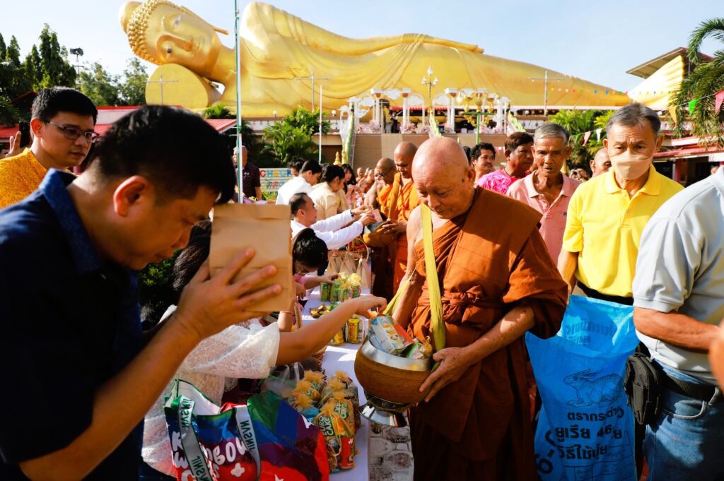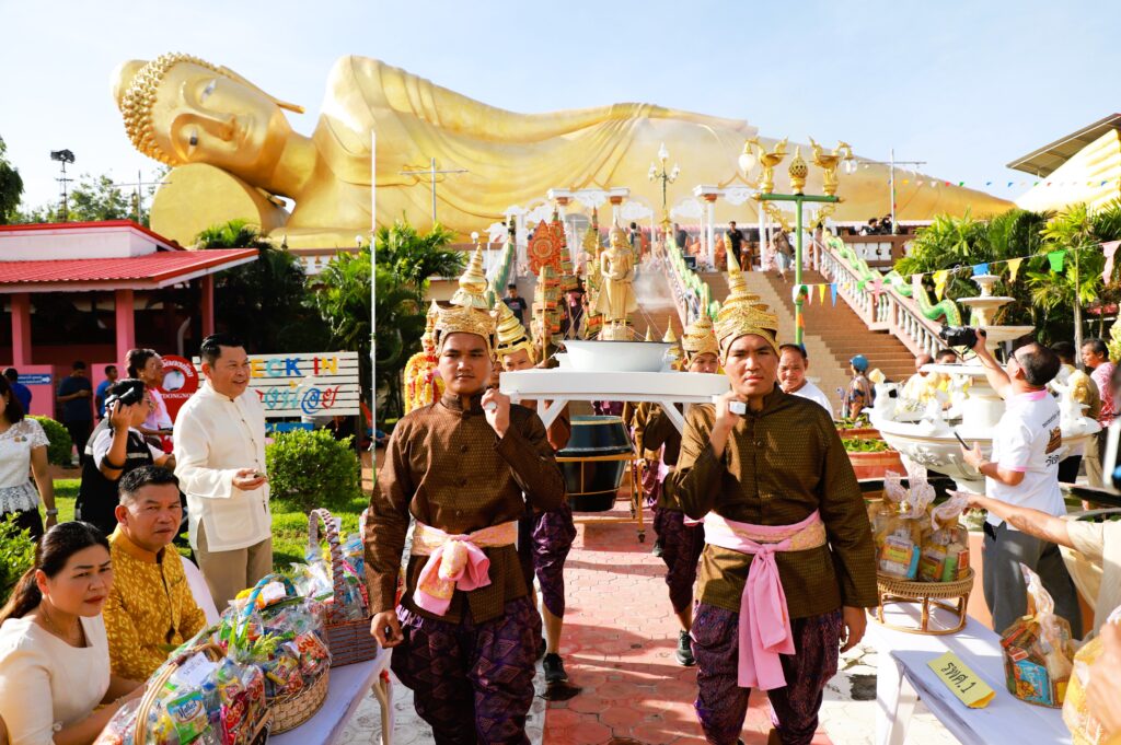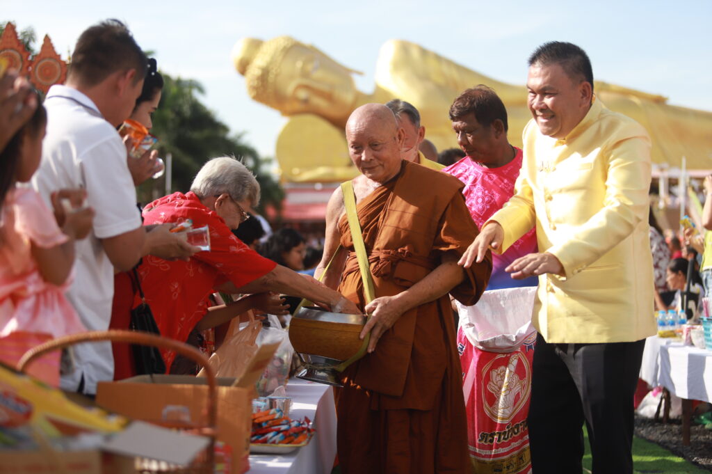 ซึ่งการจัดงานในปีนี้จัดรูปขบวนให้มีผู้แต่งกายเป็น เทวดา พระอินทร์ นางฟ้า เดินนำพระสงฆ์ ลงมาจาก พระพุทธไสยาสน์องค์ใหญ่ที่สุดของจังหวัดลพบุรี ที่มีความยาว 45 เมตร กว้าง 4 เมตร และสูง 16 เมตร ซึ่งเป็นที่เลื่อมใสศรัทธาขอพุทธศาสนิกชนทั่วไปรวมถึงเป็นการส่งเสริมการท่องเที่ยวตามวิถีไทย วิถีพุทธ เนื่องในเทศกาลวันออกพรรษา ซึ่งพระสงฆ์ได้เดินลงเพื่อมารับบิณฑบาตจากพุทธศาสนิกชนที่มายืนรอใส่บาตรกันอย่างเนื่องแน่น
