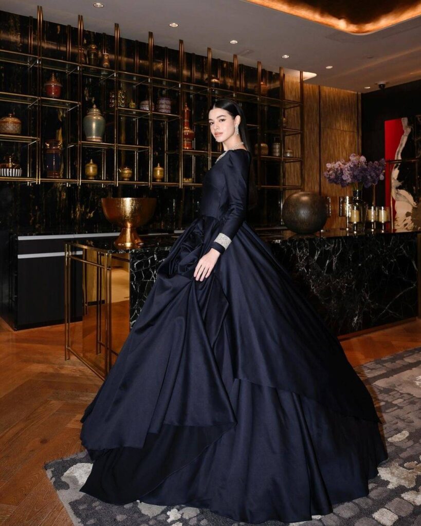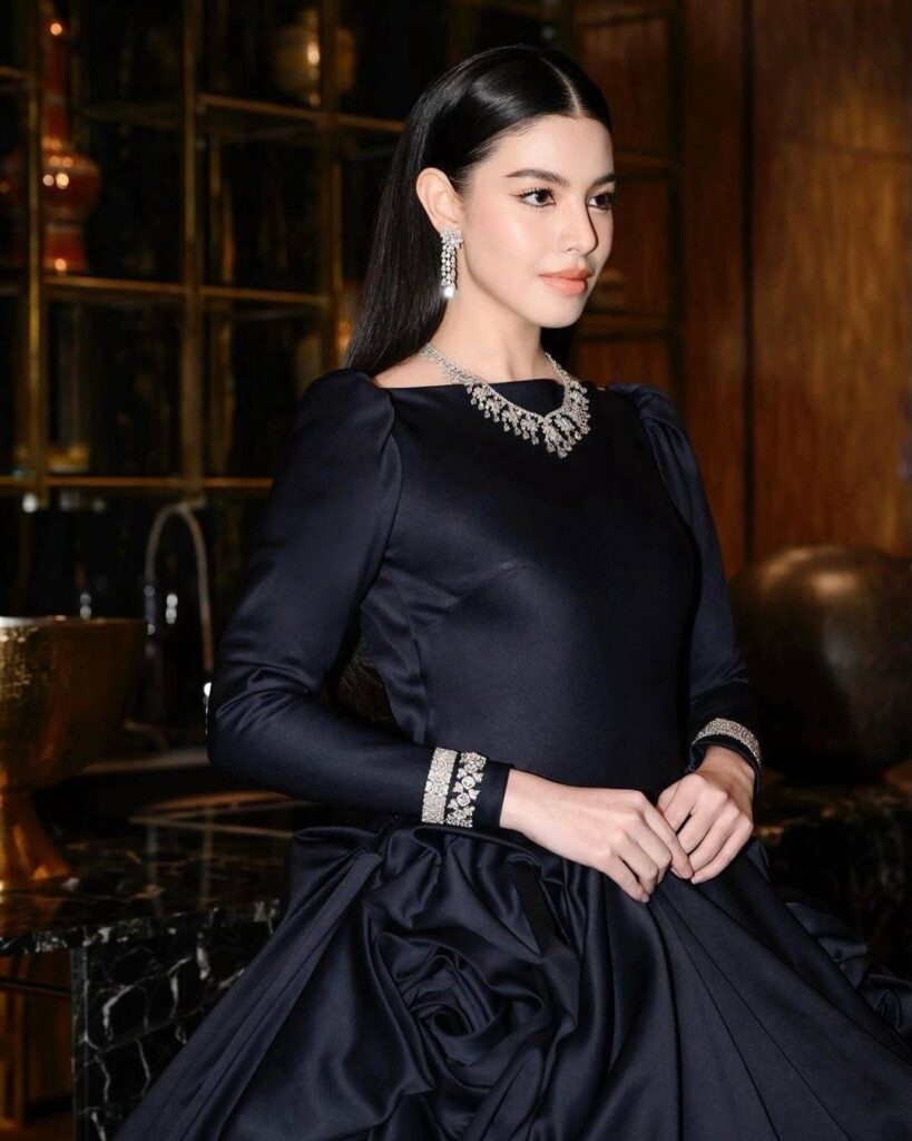 ลุค Finale ที่มีความปราณีต ยิ่งใหญ่อลังการ กับชุด ‘Formidable Navy Rose’ แรงบันดาลใจจากความเป็นผู้หญิงที่มีความสวย สง่างามอ่อนหวานแต่ภายในแข็งแกร่ง มาเป็นชุดสีกรมเข้มสุดหรู มีดีเทลตกแต่งดอกกุหลาบที่ทำด้วยช่างฝีมือทั้งหมด 2 ข้างบริเวณกระโปรง เรียกได้ว่า เรียบ แต่มีพลัง เหมาะกับคุณแคท และดูสง่างามเหมือนเจ้าหญิงเป็นที่สุด