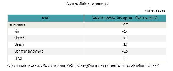 วันที่ 21 ตุลาคม 2567 สศก. หั่นเป้าทั้งปี GDP เกษตรไทย อยู่ในช่วงร้อยละ -0.8) – 0.2 : นายฉันทานนท์ วรรณเขจร เลขาธิการสำนักงานเศรษฐกิจการเกษตร (สศก.) กระทรวงเกษตรและสหกรณ์ เปิดเผยถึงภาวะเศรษฐกิจการเกษตรในไตรมาส 3 ปี 2567 (กรกฎาคม-กันยายน 2567) หดตัวร้อยละ 0.7 เมื่อเทียบกับช่วงเดียวกันของปี 2566 โดยการผลิตสินค้าเกษตรบางส่วนในไตรมาส 3 ได้รับผลกระทบจากเอลนีโญ ส่งผลให้ปริมาณฝนน้อย และอากาศแห้งแล้ง และยังได้รับผลกระทบลานีญาที่เกิดขึ้นในเดือนกันยายน 2567 ทำให้มีมรสุมและฝนตกหนักต่อเนื่องในหลายพื้นที่ เกิดอุทกภัยน้ำป่าไหลหลากในภาคเหนือและภาคตะวันออกเฉียงเหนือ ส่งผลให้สาขาพืชและสาขาบริการทางการเกษตรยังคงหดตัวต่อเนื่องจากไตรมาส 2 เช่นเดียวกับสาขาประมง หดตัวเช่นเดียวกัน ขณะที่สาขาปศุสัตว์และสาขาป่าไม้ ยังขยายตัวได้ สำหรับรายละเอียดในแต่ละสาขา พบว่า สาขาพืช หดตัวร้อยละ 0.4 จากปรากฏการณ์เอลนีโญที่ต่อเนื่องมาจนถึงช่วงเดือนเมษายน 2567 ทำให้สภาพอากาศร้อนจัดและแห้งแล้ง ส่งผลกระทบต่อการเพาะปลูกและการเจริญเติบโตของพืชบางส่วน ทำให้ผลผลิตพืชหลายชนิดลดลง แม้ว่าปรากฏการณเอลนีโญจะสิ้นสุดลงในเดือนมิถุนายน 2567 แต่การเข้าสู่ปรากฏการณ์ลานีญาในเดือนกันยายน 2567 ทำให้ประเทศไทยเผชิญกับมรสุมและมีฝนตกหนัก เกิดอุทกภัยในหลายพื้นที่ทางภาคเหนือและภาคตะวันออกเฉียงเหนือ รวมทั้งสภาพอากาศที่มีความชื้นสูง ส่งผลต่อคุณภาพของผลผลิต และมีโรคพืชและแมลงรบกวน สำหรับสินค้าพืชที่มีผลผลิตลดลง ได้แก่ ข้าวนาปรัง มันสำปะหลัง ยางพารา ทุเรียน และเงาะ โดยข้าวนาปรัง ผลผลิตลดลง เนื่องจากในช่วงเพาะปลูกมีปริมาณน้ำในอ่างเก็บน้ำและตามแหล่งน้ำธรรมชาติน้อยกว่าปีที่ผ่านมา ทำให้มีน้ำต้นทุนไม่เพียงพอ และภาครัฐขอความร่วมมือให้ลดการเพาะปลูกข้าวนาปรัง เกษตรกรบางพื้นที่จึงปล่อยที่นาให้ว่าง หรือปรับเปลี่ยนไปปลูกพืชใช้น้ำน้อยหรือพืชผักแทน มันสำปะหลัง ผลผลิตลดลงตามเนื้อที่เก็บเกี่ยวที่ลดลง เนื่องจากเกษตรกรขาดแคลนท่อนพันธุ์จากสภาพอากาศที่แห้งแล้งและฝนทิ้งช่วง ท่อนพันธุ์ดีหายากและมีราคาสูง ทำให้เกษตรกรบางรายปล่อยพื้นที่ให้ว่างหรือเปลี่ยนไปปลูกพืชอื่น เช่น สับปะรด ยางพารา ข้าวโพดหวาน และข้าวโพดเมล็ดพันธุ์ นอกจากนี้ ยังพบการเกิดโรคใบด่างอย่างต่อเนื่อง ส่งผลให้ผลผลิตต่อไร่ลดลง ยางพารา ผลผลิตลดลง เนื่องจากพื้นที่ปลูกในภาคใต้และภาคเหนือยังคงมีการระบาดของโรคใบร่วง ประกอบกับเกษตรกรในภาคใต้และภาคกลางบางส่วนมีการตัดโค่นต้นยางอายุมากเพื่อปรับเปลี่ยนไปป