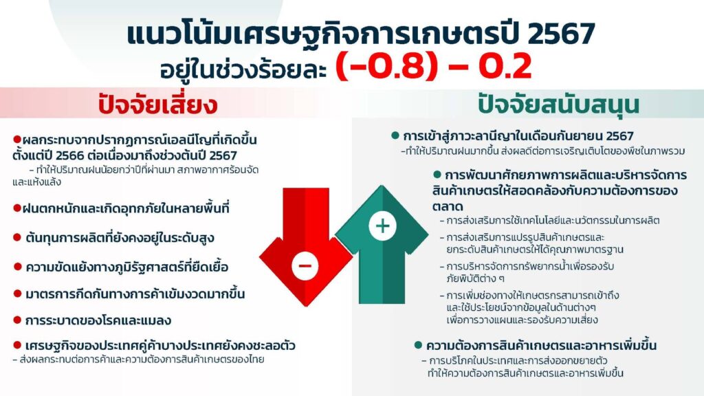 แนวโน้มเศรษฐกิจการเกษตรในปี 2567 คาดว่าจะอยู่ในช่วงร้อยละ (-0.8) – 0.2 เมื่อเทียบกับปี 2566 เนื่องจากปรากฏการณ์เอลนีโญที่ทำให้เกิดความแห้งแล้งในช่วงครึ่งปีแรก และปรากฏการณ์ลานีญาในช่วงครึ่งปีหลังที่ทำให้เกิดอุทกภัย อย่างไรก็ตาม ปริมาณฝนที่มากขึ้นยังส่งผลดีต่อการเจริญเติบโตของพืชในภาพรวม ประกอบกับการส่งเสริมการใช้เทคโนโลยีและนวัตกรรม ยกระดับสินค้าเกษตรให้มีคุณภาพมาตรฐาน การบริหารจัดการน้ำ การเพิ่มช่องทางให้เกษตรกรสามารถเข้าถึงและใช้ประโยชน์ข้อมูลเพื่อการวางแผน ตลอดจนการช่วยเหลือเกษตรกรที่ได้รับผลกระทบจากภัยพิบัติต่างๆ รวมถึงเศรษฐกิจในประเทศมีแนวโน้มขยายตัว โดยเฉพาะการบริโภคและการส่งออก ทำให้มีความต้องการสินค้าเกษตรเพิ่มขึ้น