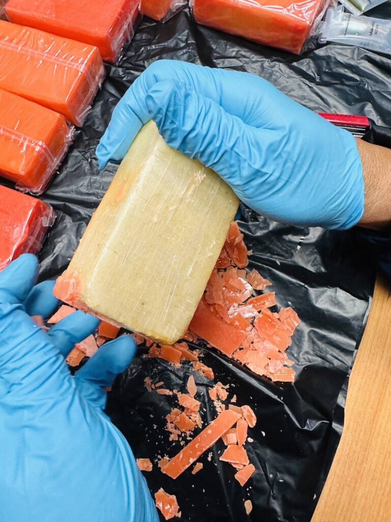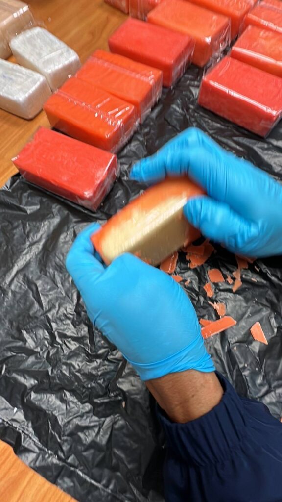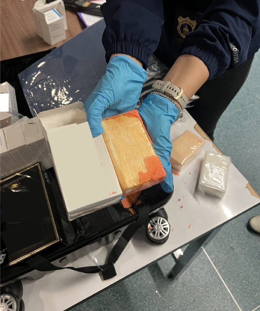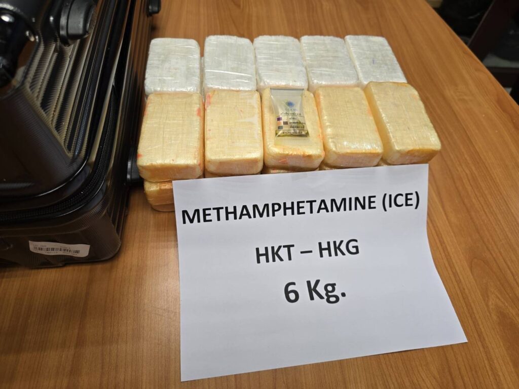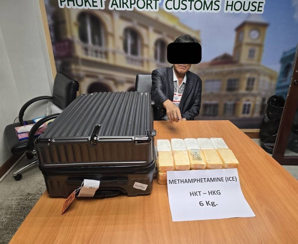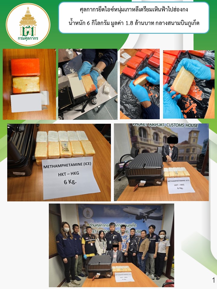 โดยวานนี้ (21 ตุลาคม 2567) กรมศุลกากร โดยกองสืบสวนและปราบปรามและด่านศุลกากรท่าอากาศยานภูเก็ต ซึ่งอยู่ในความดูแลของสำนักงานศุลกากรภาคที่ 5 ร่วมกับหน่วยสกัดกั้นยาเสพติดผ่านท่าอากาศยาน (Airport Interdiction Task Force: AITF) ประกอบด้วยสำนักงานคณะกรรมการป้องกันและปราบปรามยาเสพติด (ป.ป.ส.) และกองบัญชาการตำรวจปราบปรามยาเสพติด (บช.ปส.) ได้ร่วมกันวิเคราะห์ สืบสวนหาข่าวเกี่ยวกับเครือข่ายลักลอบส่งออกยาเสพติดผ่านท่าอากาศยาน พบชายชาวเกาหลีใต้มีความเสี่ยงลำเลียงยาเสพติดออกนอกประเทศ และมีกำหนดการจะเดินจากท่าอากาศยานนานาชาติภูเก็ต ประเทศไทย ปลายทางเขตบริหารพิเศษฮ่องกงแห่งสาธารณรัฐประชาชนจีน ในวันที่ 20 ตุลาคม 2567 จึงทำการตรวจสอบสัมภาระพบกระเป๋าเดินทางทรงแข็งมีล้อลากสีดำ ระบุชื่อตรงกับผู้โดยสารต้องสงสัยจึงนำกระเป๋าเดินทางดังกล่าวไปตรวจสอบเบื้องต้นด้วยเครื่องเอกซเรย์ ปรากฏภาพภายในกระเป๋ามีวัตถุต้องสงสัย ลักษณะหนาแน่นผิดปกติ จึงได้เชิญผู้โดยสารต้องสงสัยซึ่งเป็นเจ้าของกระเป๋า นำตรวจค้นกระเป๋าเดินทางดังกล่าว จากการตรวจค้นพบ เสื้อผ้า กล่องสบู่ จำนวน 30 กล่อง และสัมภาระอื่นๆ เมื่อตรวจสอบด้านในสบู่พบพลาสติกใส บรรจุเกล็ดสีขาวอัดแน่นเป็นก้อนรูปสี่เหลี่ยม จึงนำตัวอย่างวัตถุต้องสงสัยมาทดสอบเบื้องต้นด้วยน้ำยาเคมี ONCB 051 MARQUIS REAGENT ให้ผลเปลี่ยนจากสีใสไม่มีสี เป็นสีน้ำตาล ซึ่งเป็นยาเสพติดให้โทษในประเภท 1 เมทแอมเฟตามีน (ไอซ์) น้ำหนักรวมสิ่งห่อหุ้ม 6,000 กรัม มูลค่า 1.8 ล้านบาท