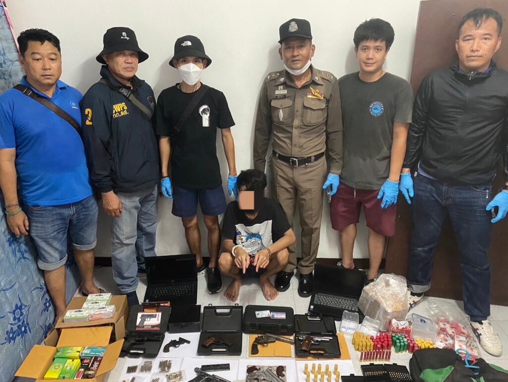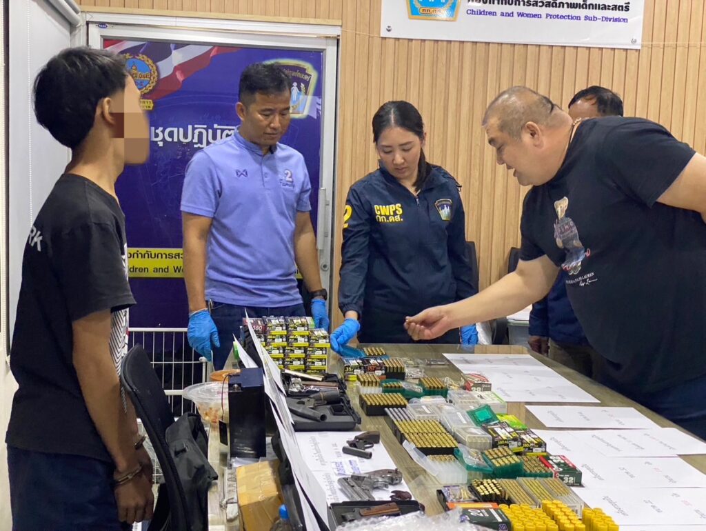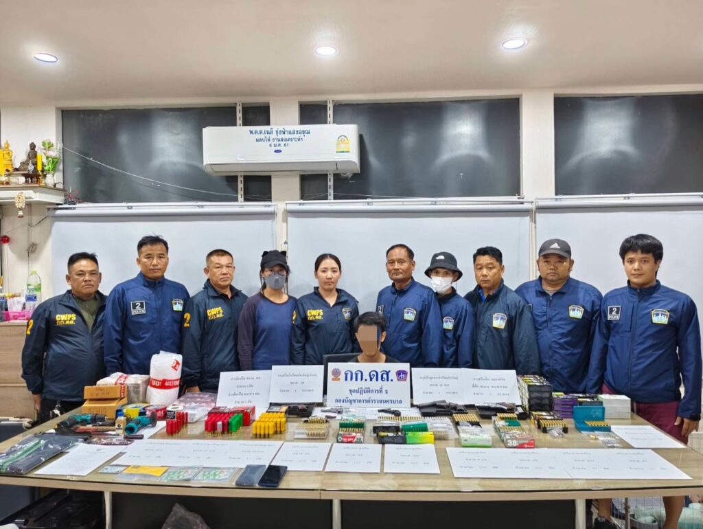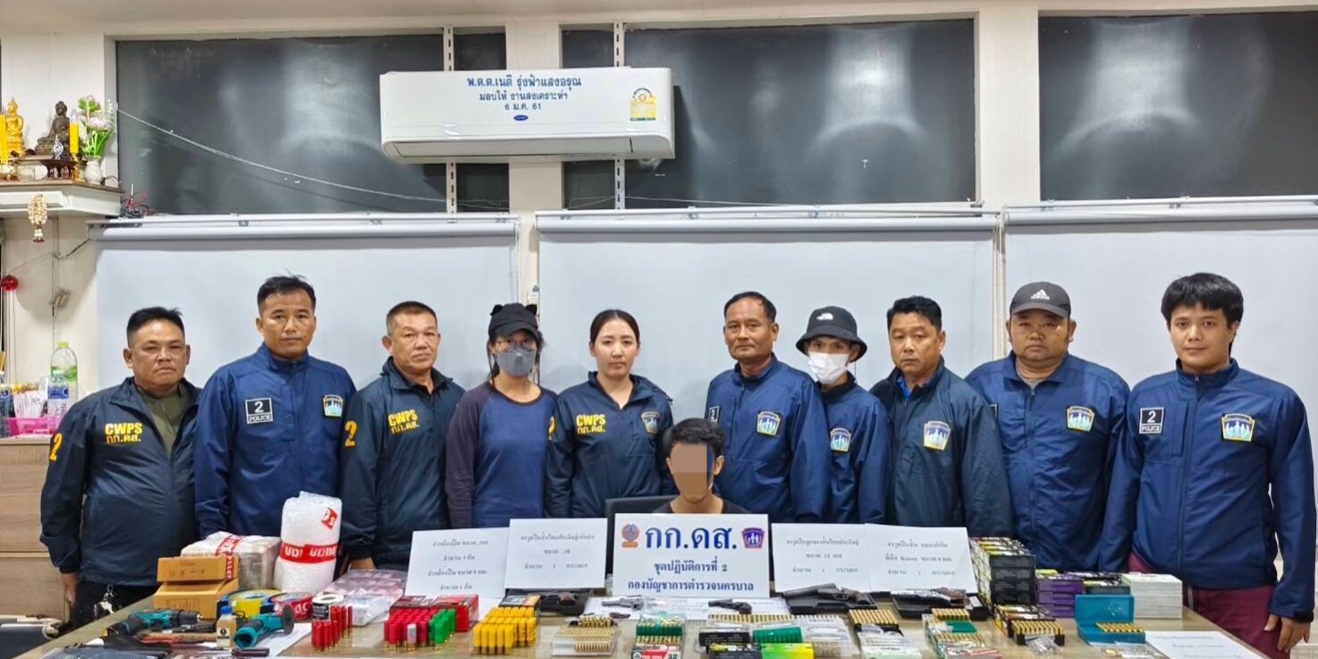 ร่วมกันจับกุมตัว นายวงศกร หรือ (นุ๊ก) ผู้ต้องหาตามหมายค้น ศาลอาญา ที่ 993/2567 ลงวันที่ 22 ตุลาคม 2567 ในข้อกล่าวหา “กระทำความผิดฐาน มีอาวุธปืน ไว้ในครอบครองโดยไม่ได้รับอนุญาต และ มีเครื่องกระสุนปืนไว้ในครอบครองโดยไม่ได้รับอนุญาต” พร้อมด้วยของกลาง อาวุธปืนหักลำไทยประดิษฐ์ ขนาด 12 เกจ ทะเบียน พจ 5/11497 จำนวน 1 กระบอก,อาวุธปืนหักลำไทยประดิษฐ์ ขนาด 9 มม. (หักลำจิ๋ว) จำนวน1 กระบอก,อาวุธปืนไทยประดิษฐ์ Derringer ขนาด .38 นิ้ว จำนวน 1 กระบอก,อาวุธปืนหักลำไทยประดิษฐ์ ขนาด .38 นิ้ว จำนวน 1 กระบอก,อาวุธปืนสั้น แบลงค์กัน ยี่ห้อ Kuzey ขนาด 9 มม. พร้อมแมกกาซีน 2 อัน จำนวน1 กระบอก,ลำกล้องปืน ขนาด .380 นิ้ว จำนวน 3 อัน,ลำกล้องปืน ขนาด 9 มม.จำนวน 1 อัน,กระสุนปืนลูกซอง ขนาด .410 นิ้ว ยี่ห้อ ARMUSA สีแดง 10 นัด,กระสุนปืนลูกซอง ขนาด 12 เกจ ยี่ห้อ THAIARMS สีแดง 26 นัด,กระสุนปืนลูกซอง ขนาด 12 เกจ ไม่มียี่ห้อ 1 นัด,กระสุนปืนลูกซอง ขนาด 12 เกจ ยี่ห้อ THAIARMS สีเขียว 11 นัด,กระสุนปืนลูกซอง ขนาด 20 เกจ ARMUSA สีเหลือง 14 นัด,กระสุนปืนลูกซอง ขนาด 20 เกจ สีเหลือง ไม่มียี่ห้อ 23 นัด,กระสุนปืน ขนาด .45 AUTO ยี่ห้อ FEDERAL 35 นัด