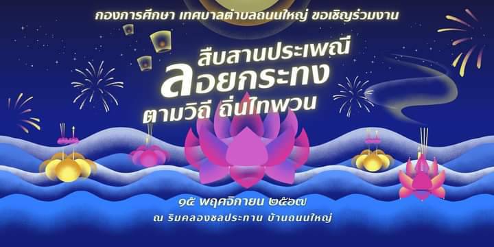 ประเพณีลอยกระทงเป็นประเพณีที่สำคัญของคนไทยในฤดูน้ำหลาก เป็นการแสดงความกตัญญูกตเวทีต่อผู้มีพระคุณ โดยเฉพาะสายน้ำที่ใช้ในการดำรงชีวิต เช่น แม่น้ำลำคลอง ประเพณีนี้ยังสะท้อนให้เห็นถึงภูมิปัญญา วิถีชีวิตและวัฒนธรรมไทยอันงดงาม ที่ปรากฏในรูปแบบของพิธีกรรม การประดิษฐ์กระทง การประดับประทีปโคมไฟในยามค่ำคืน การแสดงมหรสพ และการละเล่นรื่นเริงต่าง ๆ ในปี 2567 นี้ กระทรวงวัฒนธรรม โดยก่อการศึกษาเทศบาลตำบลถนนใหญ่