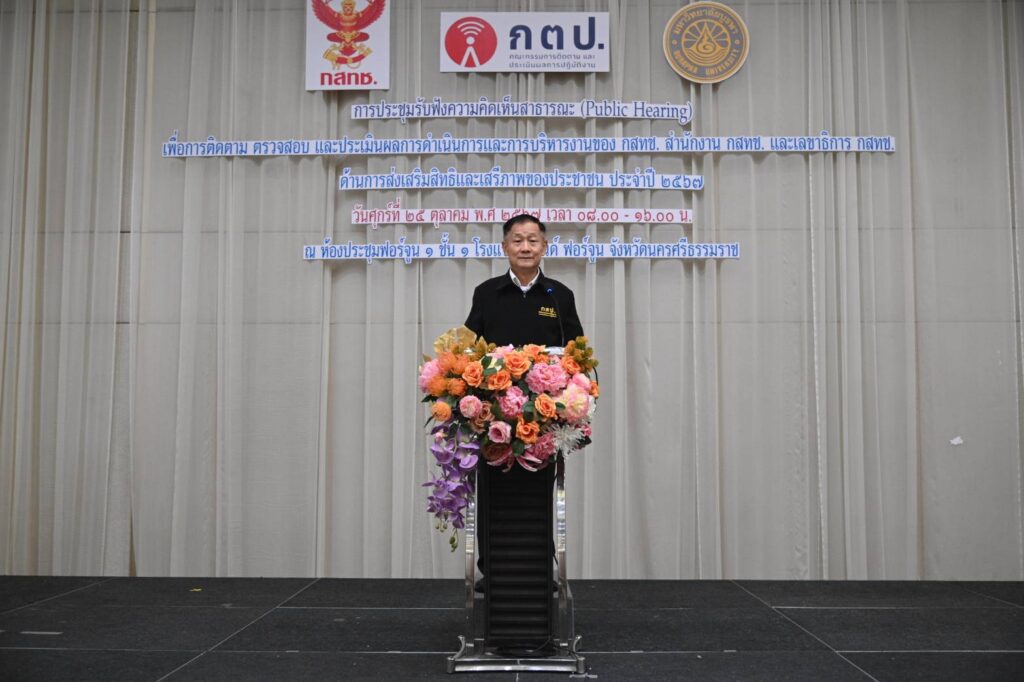 จังหวัดนครศรีธรรมราช 25 ตุลาคม 2567 – พลเรือเอก ประสาน สุขเกษตร ประธานคณะกรรมการติดตามและประเมินผล การปฏิบัติงาน ตาม พรบ. กสทช. และ กตป. ด้านการส่งเสริมสิทธิและเสรีภาพของประชาชน เปิดเผยว่า วันนี้ (25 ตุลาคม 2567) กตป. ได้ร่วมกับ สำนักงานคณะกรรมการกิจการกระจายเสียง กิจการโทรทัศน์และกิจการโทรคมนาคมแห่งชาติ (สำนักงาน กสทช.) และที่ปรึกษามหาวิทยาลัยบูรพา จัดประชุมเพื่อรับฟัง ความคิดเห็นสาธารณะ (Public Hearing) การติดตาม ตรวจสอบและประเมินผลการดำเนินการและ การบริหารงานของ กสทช. สำนักงาน กสทช. และเลขาธิการ กสทช. ใน ด้านการส่งเสริมสิทธิและเสรีภาพของประชาชน ประจำปี 2567 ขึ้นที่จังหวัดนครศรีธรรมราช การประชุมในวันนี้มีวัตถุประสงค์เพื่อรับฟังความคิดเห็นของประชาชน โดยมีกลุ่มเป้าหมายที่เกี่ยวข้อง อาทิ หน่วยงานราชการ สื่อมวลชน ผู้ประกอบการ ด้านการท่องเที่ยว ผู้ประกอบการภาคอุตสาหกรรมการผลิต บุคลากรจากสถาบันการศึกษา เจ้าหน้าทีีสาธารณสุข ผู้ด้อยโอกาส ผู้สูงอายุ ผู้พิการ ผู้นำชุมชน กลุ่มชาติพันธุ์ รวมทั้งเครือข่ายคุ้มครองผู้บริโภค
