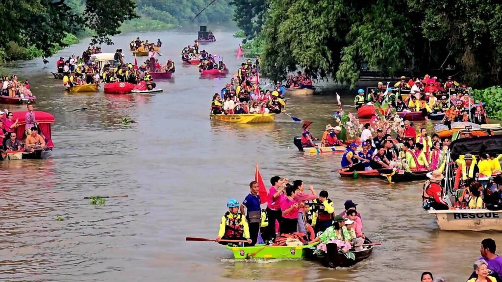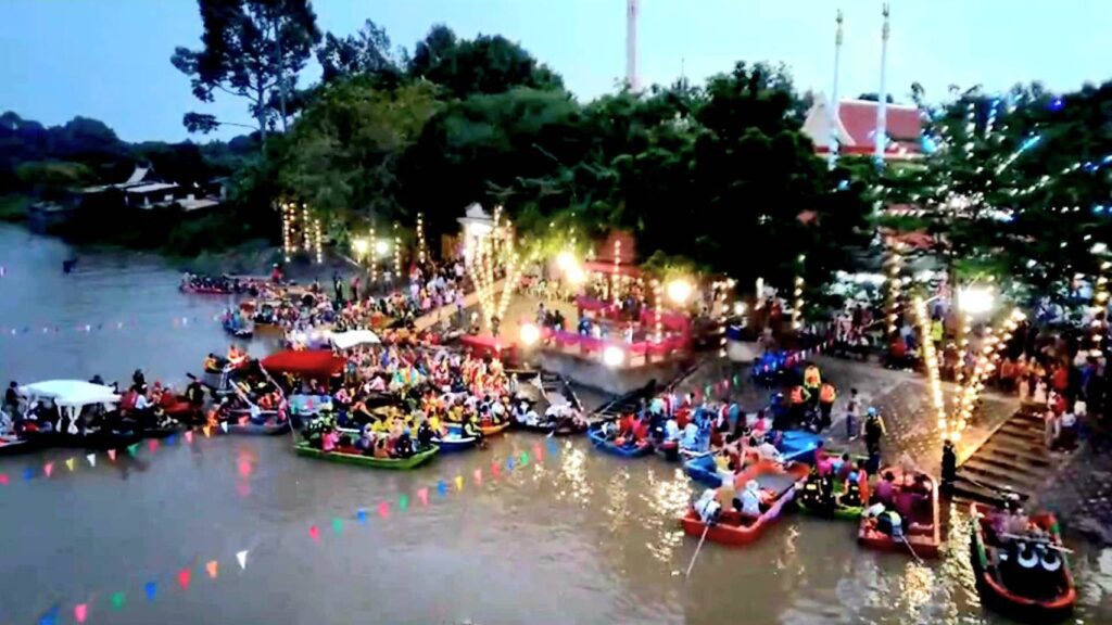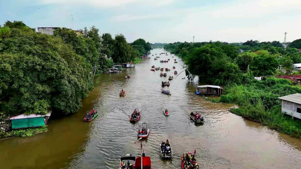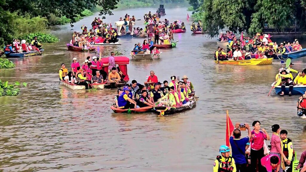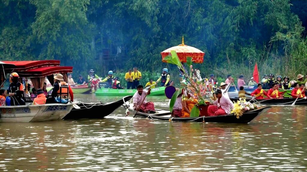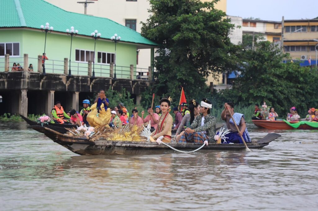โดยในปีนี้ ขบวนผ้าป่าทางเรือ กว่า 60 ลำ ได้เริ่มเคลื่อนขบวนออกจากท่าน้ำลพบุรี เพื่อร่วมกันแห่ผ้าป่าทางเรือไปตามสายน้ำในแม่น้ำลพบุรี และนำไปทอดผ้าป่ากลางน้ำ บริเวณหน้าคุ้มวัดต่างๆ รวม 4 วัด ที่ตั้งอยู่ริมแม่น้ำลพบุรี ประกอวด้วย วัดเชิงท่า วัดมะปรางหวาน วัดพรหมมาสตร์ และวัดอัมพวัน