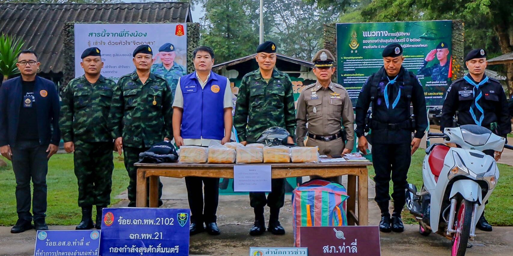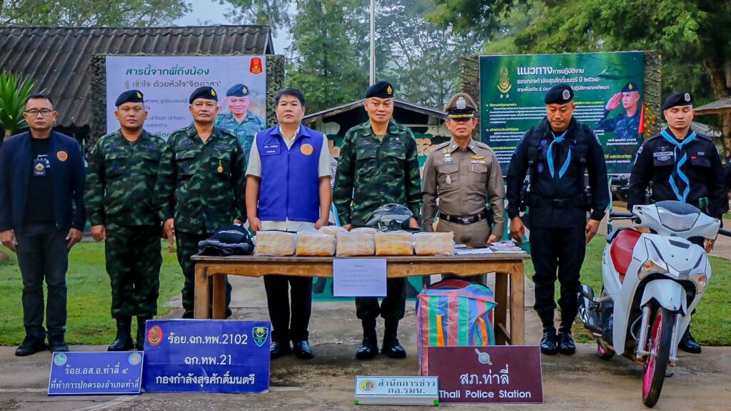 หน่วยปัญชาการสกัดกั้นและปราบปรามยาเสพติด สารตั้งตัน และเคมีภัณฑ์ชายแดนภาคตะวันออกเฉียงเหนือ ภายใต้การนำ พลโท บุญสิน พาดกลาง แม่ทัพภาคที่ 2/ผู้บัญชาการหน่วยปัญชาการสกัดกั้นและปราบปรามยาเสพติด สารตั้งตัน และเคมีภัณฑ์ชายแดนภาคตะวันออกเฉียงเหนือ (ผบ.นบ.ยส.24) ยังคง“ปฏิบัติการรุกคืบ ไม่ลดละ” เพื่อให้พื้นที่รับผิดชอบปลอดจากการลักลอบนำเข้ายาเสพติด ไม่มีการแพร่ระบาด ประชาชนเกิดความปลอดภัยในชีวิต และทรัพย์สิน โดย เมื่อวันที่ 26 ต.ค. 67 เวลา 03.00 น. กองกำลังสุรศักดิ์มนตรี โดย หน่วยเฉพาะกิจกรมทหารพรานที่ 21 (ร้อย.ฉก.ทพ.2102) ทราบจากแหล่งข่าวว่ามีผู้ต้องสงสัยลำเลียงสิ่งผิดกฎหมายเข้ามายังพื้นที่จึงทำการตั้งจุดตรวจ/จุดสกัด และเมื่อผู้ต้องสงสัยถึงจุดตรวจ/จุดสกัด และทำการฝ่าจุดตรวจ จนท. จึงได้นำกำลังติดตามทำให้ผู้ต้องสงสัยรถเสียหลังลงข้างทาง สามารถจับผู้ต้องหา 1 ราย พร้อมของกลางยาบ้า 1 กระสอบ 210,000 เม็ด และรถจักรยานยนต์ 1 คัน จึงประสาน จนท.สภ.ท่าลี่ ร่วมตรวจนับของกลางที่ ทก.ร้อย ฉก.ทพ.2102 เพื่อส่งดำเนินการตามกฎหมายต่อไป