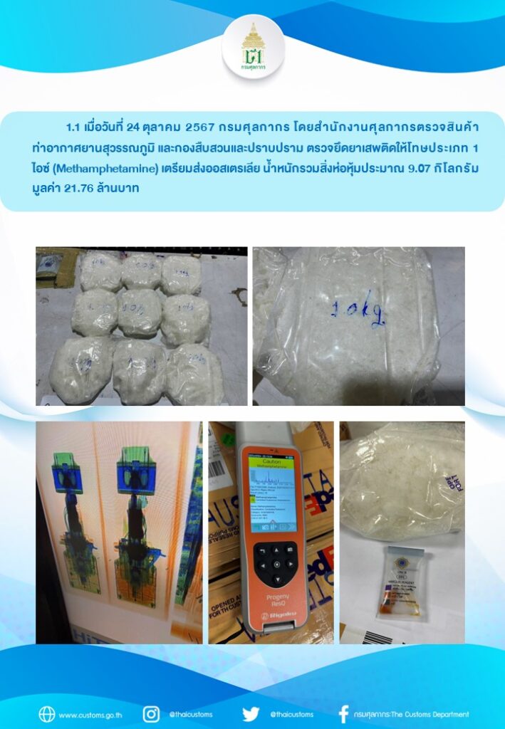1.1 เมื่อวันที่ 24 ตุลาคม 2567 กรมศุลกากร โดยสำนักงานศุลกากรตรวจสินค้าท่าอากาศยานสุวรรณภูมิ และกองสืบสวนและปราบปราม ได้ดำเนินการตรวจสอบใบขนสินค้าเร่งด่วนขาออก ปลายทางประเทศออสเตรเลีย
