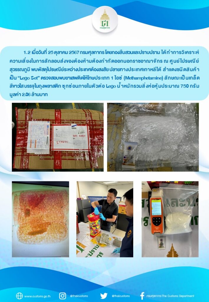 1.2 เมื่อวันที่ 25 ตุลาคม 2567 กรมศุลกากร โดยกองสืบสวนและปราบปราม ได้ทำการวิเคราะห์ความเสี่ยงในการลักลอบส่งของต้องห้ามต้องกำกัดออกนอกราชอาณาจักร ณ ศูนย์ไปรษณีย์สุวรรณภูมิ พบพัสดุไปรษณีย์ระหว่างประเทศต้องสงสัย ปลายทางประเทศเกาหลีใต้ สำแดงชนิดสินค้าเป็น “Lego Set” ตรวจสอบพบยาเสพติดให้โทษประเภท 1 ไอซ์ (Methamphetamine) ลักษณะเป็นเกล็ดสีขาวใส บรรจุในถุงพลาสติก ซุกซ่อนภายในตัวต่อ Lego น้ำหนักรวมสิ่งห่อหุ้มประมาณ 750 กรัม มูลค่า 2.06 ล้านบาท