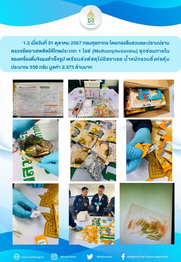 ความเสี่ยงในการลักลอบส่งของต้องห้ามต้องกำกัดออกนอกราชอาณาจักร ณ ศูนย์ไปรษณีย์สุวรรณภูมิ พบพัสดุไปรษณีย์ระหว่างประเทศต้องสงสัย ปลายทางประเทศอิสราเอล สำแดงชนิดสินค้าเป็น “SNACK” ตรวจสอบพบยาเสพติดให้โทษ ประเภท 1 ไอซ์ (Methamphetamine) ลักษณะเป็นเกล็ดสีขาวใส ห่อหุ้มด้วยกระดาษฟลอยด์ ซุกซ่อนภายในซองเครื่องดื่มขิงผงสำเร็จรูป น้ำหนักรวมสิ่งห่อหุ้มประมาณ 950 กรัม มูลค่า 2.375 ล้านบาท