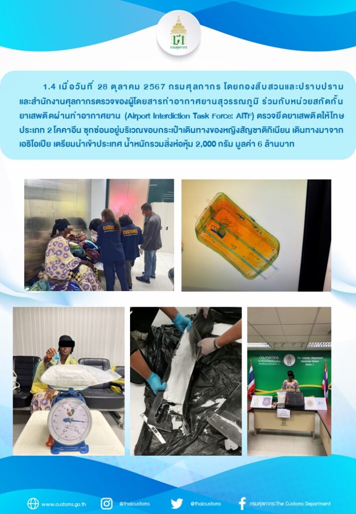 ตรวจของผู้โดยสารท่าอากาศยานสุวรรณภูมิ ร่วมกับหน่วยสกัดกั้นยาเสพติดผ่านท่าอากาศยาน (Airport Interdiction Task Force: AITF) ได้ร่วมกันวิเคราะห์ สืบสวนหาข่าวเกี่ยวกับเครือข่ายลักลอบนำเข้ายาเสพติดผ่านท่าอากาศยาน พบหญิงสัญชาติกิเนียน มีความเสี่ยงลำเลียงยาเสพติดเข้ามาในราชอาณาจักร เดินทางมาจากเมืองแอดดิสอาบาบา ประเทศเอธิโอเปีย ปลายทางท่าอากาศยานนานาชาติสุวรรณภูมิ ประเทศไทย จึงทำการตรวจสอบ พบยาเสพติดให้โทษประเภท 2 โคคาอีน ซุกซ่อนอยู่บริเวณขอบกระเป๋าเดินทาง น้ำหนักรวมสิ่งห่อหุ้ม 2,000 กรัม มูลค่า 6 ล้านบาท