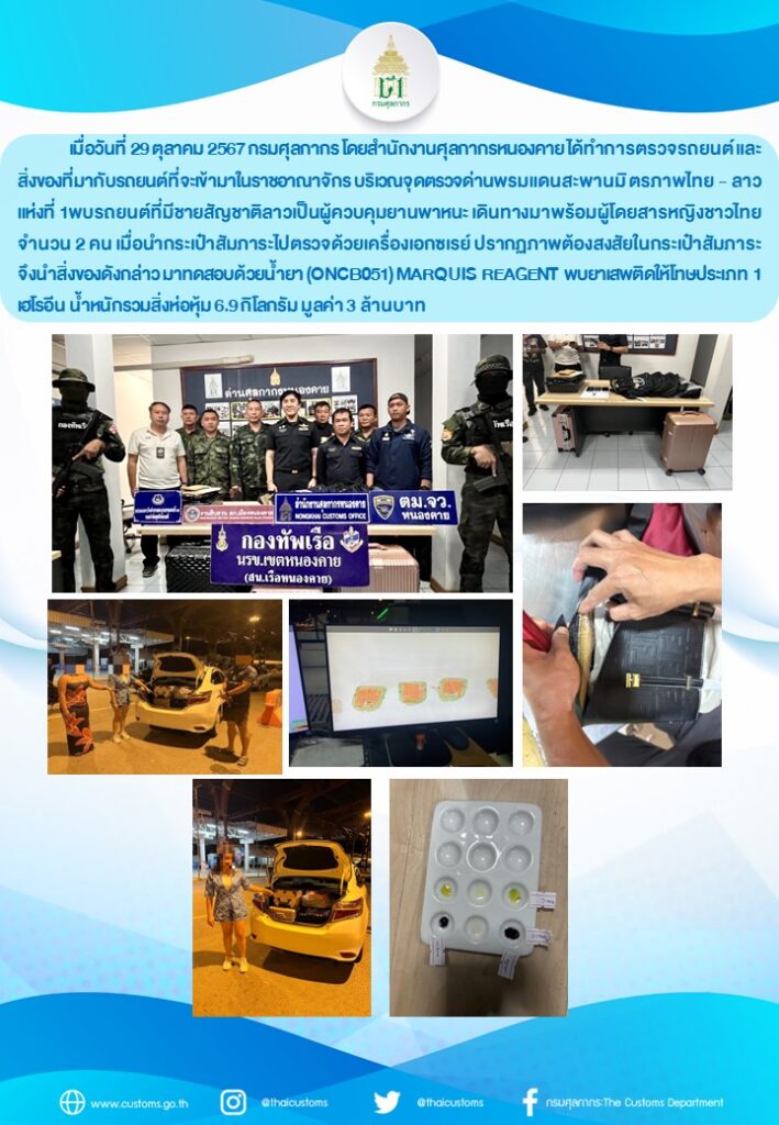 1.5 เมื่อวันที่ 29 ตุลาคม 2567 กรมศุลกากร โดยสำนักงานศุลกากรหนองคาย ได้ทำการตรวจรถยนต์และสิ่งของที่มากับรถยนต์ที่จะเข้ามาในราชอาณาจักร บริเวณจุดตรวจด่านพรมแดนสะพานมิตรภาพไทย – ลาว แห่งที่ 1 พบรถยนต์ที่มีชายสัญชาติลาวเป็นผู้ควบคุมยานพาหนะ เดินทางมาพร้อมผู้โดยสารหญิงชาวไทย จำนวน 2 คน เมื่อนำกระเป๋าสัมภาระไปตรวจด้วยเครื่องเอกซเรย์ ปรากฎภาพต้องสงสัยในกระเป๋าสัมภาระ จึงนำสิ่งของดังกล่าว มาทดสอบด้วยน้ำยา (ONCB 051) MARQUIS REAGENT พบยาเสพติดให้โทษประเภท 1 เฮโรอีน น้ำหนักรวมสิ่งห่อหุ้ม 6.9 กิโลกรัม มูลค่า 3 ล้านบาท