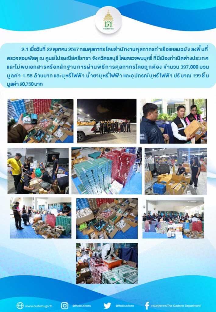 2.1 เมื่อวันที่ 22 ตุลาคม 2567 กรมศุลกากร โดยสำนักงานศุลกากรท่าเรือแหลมฉบัง ลงพื้นที่ตรวจสอบพัสดุ ณ ศูนย์ไปรษณีย์ศรีราชา จังหวัดชลบุรี โดยตรวจพบบุหรี่ ที่มีเมืองกำเนิดต่างประเทศ และไม่พบเอกสารหรือหลักฐานการผ่านพิธีการศุลกากรโดยถูกต้อง จำนวน 397,000 มวน มูลค่า 1.58 ล้านบาท และบุหรี่ไฟฟ้า น้ำยาบุหรี่ไฟฟ้า และอุปกรณ์บุหรี่ไฟฟ้า จำนวน 199 ชิ้น มูลค่า 20,750 บาท