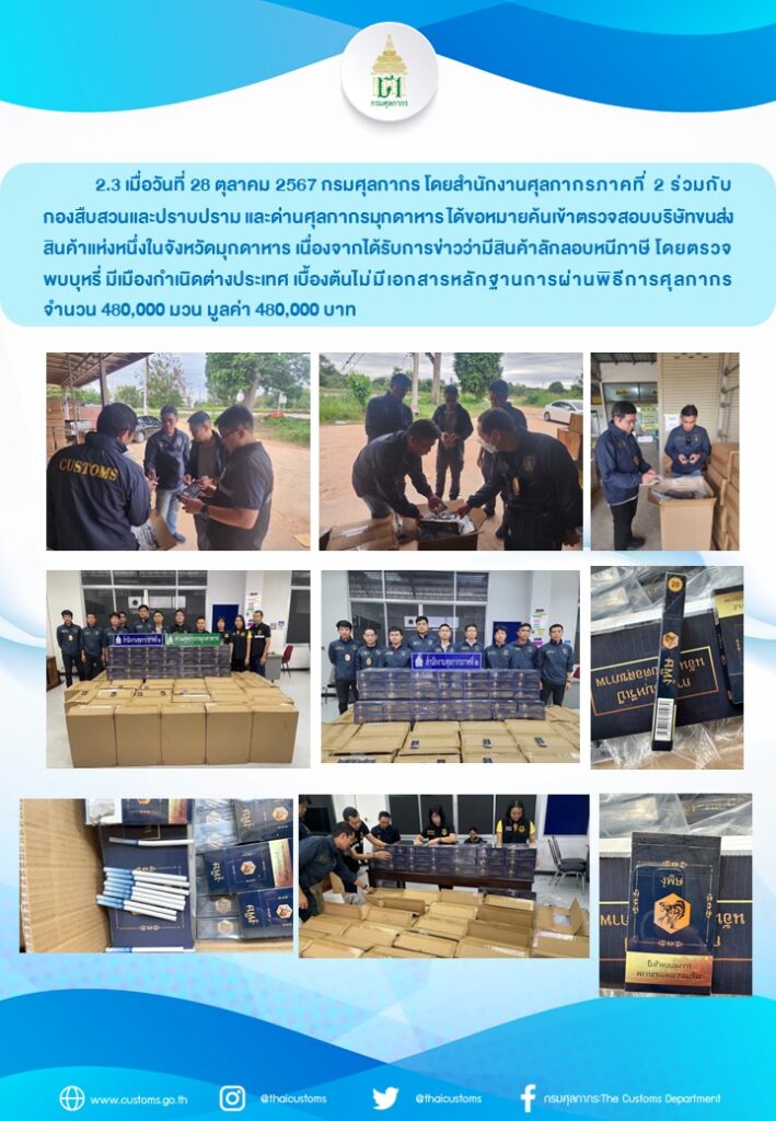 2.3 เมื่อวันที่ 28 ตุลาคม 2567 กรมศุลกากร โดยสำนักงานศุลกากรภาคที่ 2 ร่วมกับกองสืบสวนและปราบปราม และด่านศุลกากรมุกดาหาร ได้ขอหมายค้นเข้าตรวจสอบบริษัทขนส่งสินค้าแห่งหนึ่งในจังหวัดมุกดาหาร เนื่องจากได้รับการข่าวว่ามีสินค้าลักลอบหนีภาษี โดยตรวจพบบุหรี่ มีเมืองกำเนิดต่างประเทศ เบื้องต้นไม่มีเอกสารหลักฐานการผ่านพิธีการศุลกากร จำนวน 480,000 มวน มูลค่า 480,000 บาท