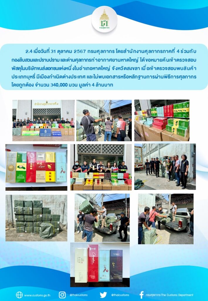 2.4 เมื่อวันที่ 31 ตุลาคม 2567 กรมศุลกากร โดยสำนักงานศุลกากรภาคที่ 4 ร่วมกับกองสืบสวนและปราบปราม และด่านศุลกากรท่าอากาศยานหาดใหญ่ ได้ขอหมายค้นเข้าตรวจสอบพัสดุในบริษัทขนส่งเอกชน