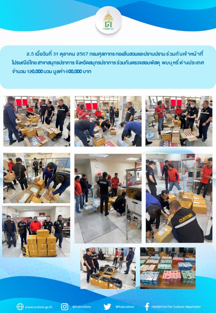 2.5 เมื่อวันที่ 31 ตุลาคม 2567 กรมศุลกากร กองสืบสวนและปราบปราม ร่วมกับเจ้าหน้าที่ไปรษณีย์ไทย สาขาสมุทรปราการ จังหวัดสมุทรปราการ ร่วมกันตรวจสอบพัสดุ พบบุหรี่ มีเมืองกำเนิดต่างประเทศ และไม่พบเอกสารหรือหลักฐานการผ่านพิธีการศุลกากรโดยถูกต้อง จำนวน 120,000 มวน มูลค่า 600,000 บาท