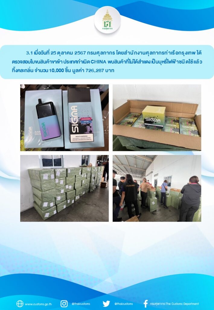 3.1 เมื่อวันที่ 25 ตุลาคม 2567 กรมศุลกากร โดยสำนักงานศุลกากรท่าเรือกรุงเทพ ได้ตรวจสอบใบขนสินค้าขาเข้า ประเทศกำเนิด CHINA พบสินค้าที่ไม่ได้สำแดง เป็นบุหรี่ไฟฟ้าชนิดใช้แล้วทิ้งคละกลิ่น