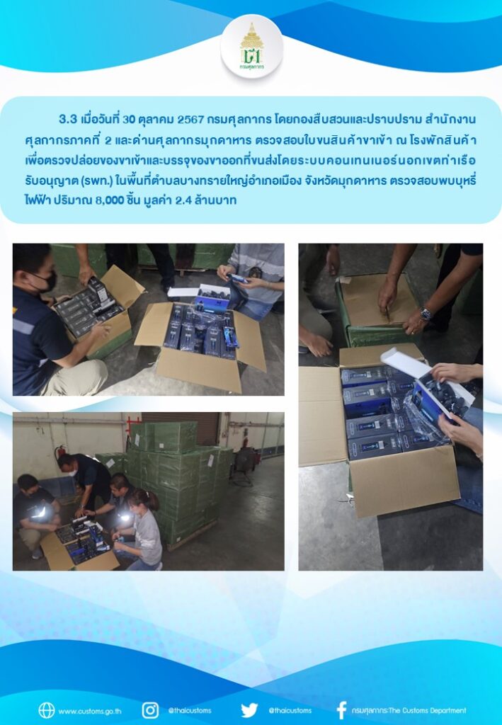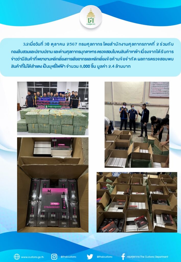 3.2 เมื่อวันที่ 30 ตุลาคม 2567 กรมศุลกากร โดยสำนักงานศุลกากรภาคที่ 2 ร่วมกับกองสืบสวนและปราบปราม และด่านศุลกากรมุกดาหาร ตรวจสอบใบขนสินค้าขาเข้า เนื่องจากได้รับการข่าวว่ามีสินค้าที่พยายามหลีกเลี่ยงการเสียอากรและหลีกเลี่ยงข้อห้ามข้อจำกัด ผลการตรวจสอบพบสินค้าที่ไม่ได้สำแดง เป็นบุหรี่ไฟฟ้า