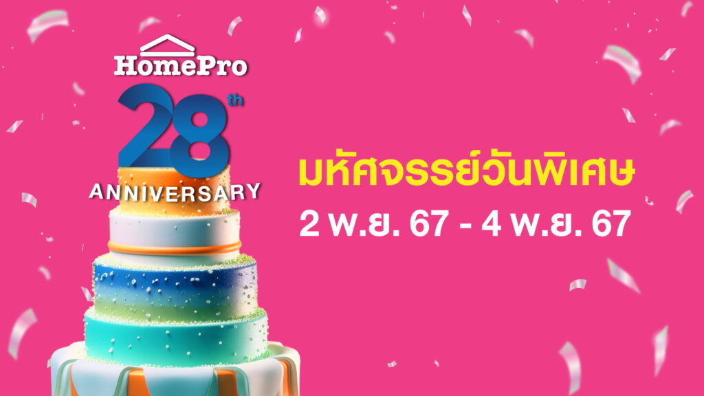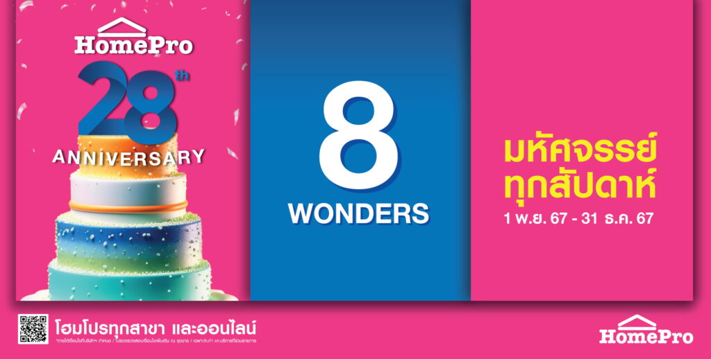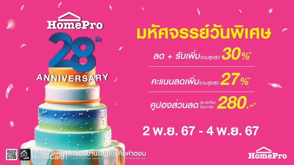 โฮมโปร ฉลองครบรอบ 28 ปี จัดแคมเปญ “HomePro 28th Anniversary” 8 WONDERS มหัศจรรย์ทุกสัปดาห์ มหกรรมช้อปสุดคุ้ม! ที่พร้อมส่งต่อสิทธิประโยชน์มากมาย 8 สัปดาห์เต็ม ให้กับผู้บริโภค เริ่มพฤศจิกายนนี้ เสิร์ฟมหัศจรรย์วันพิเศษ 2 พ.ย. 67 – 4 พ.ย. 67 รับสิทธิพิเศษเฉพาะ! สมาชิกโฮมการ์ด รับส่วนลด+รับเพิ่มรวมสูงสุด 30% / คูปองส่วนลดสุดคุ้ม รวมมูลค่าสูงสุด 2,300 บาท ที่ Line HomePro / ใช้คะแนนแทนส่วนลดรวมสูงสุด 27% พร้อมรับความพิเศษตลอดสัปดาห์แรก 1 พ.ย. 67 – 7 พ.ย. 67 กับขบวนสินค้าราคาพิเศษจากแบรนด์ชั้นนำมากมาย พร้อมสิทธิ์ Super Wonder, Super Zero ผ่อนนาน ผ่อนน้อย ได้ทั้งร้าน เมื่อช้อปตั้งแต่ 2,000 บาทขึ้นไปต่อใบเสร็จ และผ่อน 0% นาน 3 เดือน หรือเลือกผ่อนสบายนานสูงสุด 24 เดือน กับบัตรเครดิตและบัตรสินเชื่อที่ร่วมรายการ เตรียมรับความสุขต่อเนื่องถึงสิ้นปี กับช่วงเวลาแห่งการเฉลิมฉลอง “HomePro 28th Anniversary” 8 WONDERS มหัศจรรย์ทุกสัปดาห์ ตั้งแต่วันนี้-31 ธันวาคม 2567 ที่โฮมโปรทุกสาขาและช้อปออนไลน์