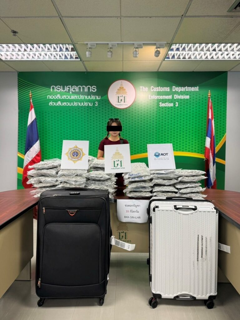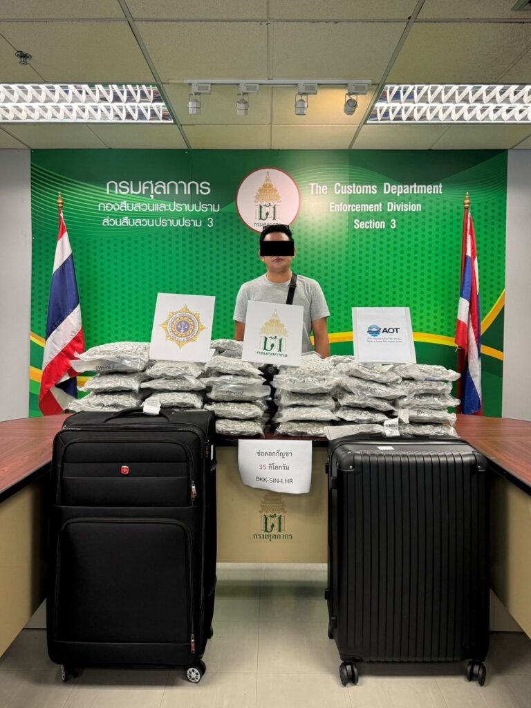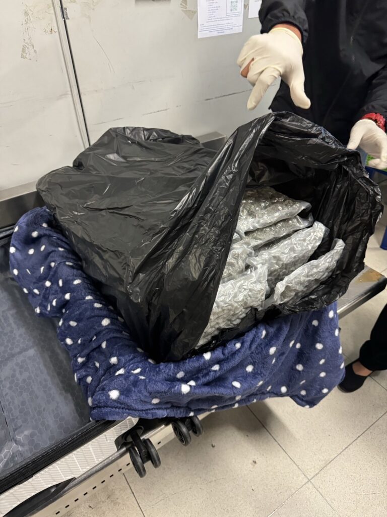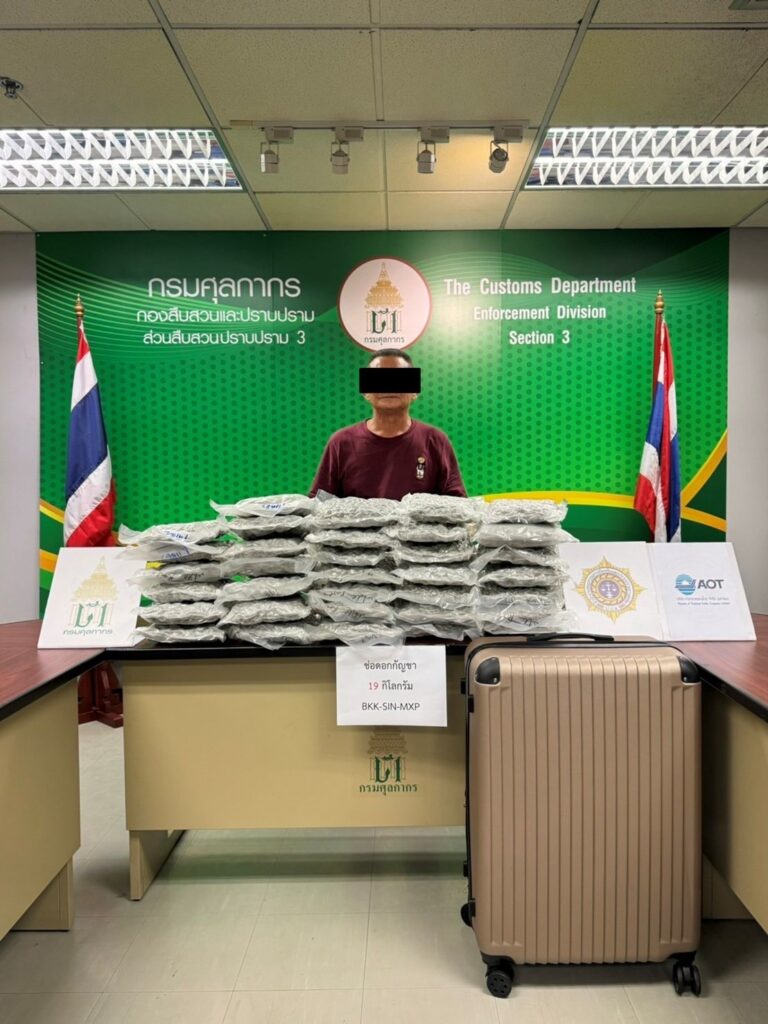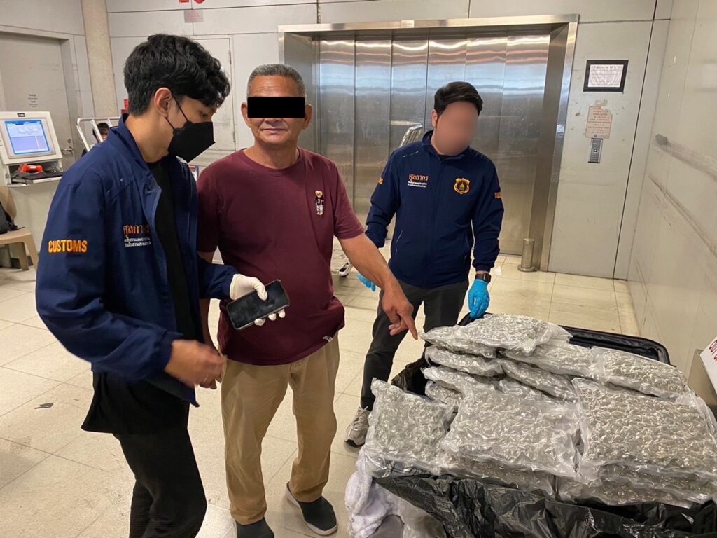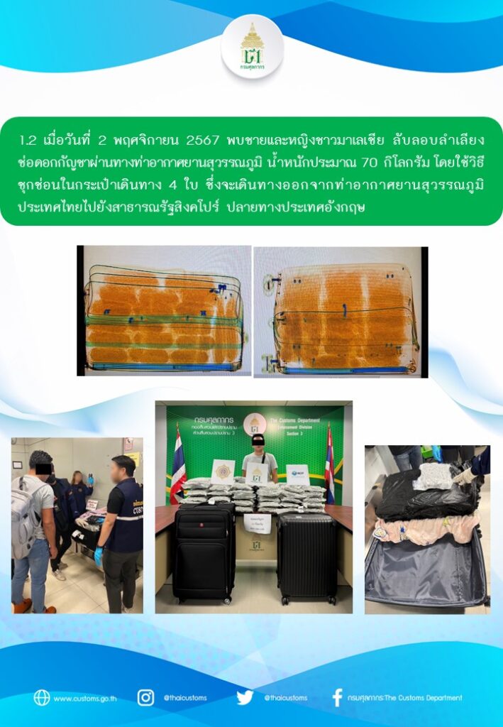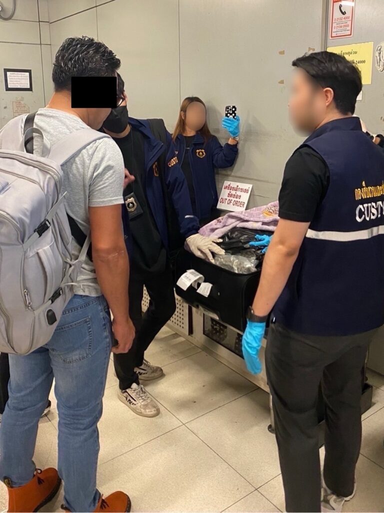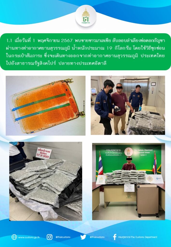 จากการวิเคราะห์ข้อมูลทางการข่าวและการแลกเปลี่ยนข้อมูลในด้านการป้องกันการลักลอบขนยาเสพติดกับหน่วยงานบังคับใช้กฎหมายต่างประเทศพบว่ามีการตรวจยึดจับกุมช่อดอกกัญชาโดยมีต้นทางจากประเทศไทยจำนวนมากในช่วงปี 2567 กรมศุลกากรจึงได้ร่วมกับชุดปฏิบัติการสกัดกั้นยาเสพติดผ่านท่าอากาศยาน (Airport Interdiction Task Force : AITF) ประกอบด้วย สำนักงานคณะกรรมการป้องกันและปราบปรามยาเสพติด (ป.ป.ส.) และ กองบัญชาการตำรวจปราบปรามยาเสพติด (บช. ปส.) เฝ้าระวังและติดตามตรวจสอบการลักลอบส่งออก – นำเข้ากัญชาผ่านท่าอากาศยานอย่างต่อเนื่อง โดยเมื่อวันที่ 1 พฤศจิกายน 2567 พบชายชาวมาเลเซีย ลักลอบนำช่อดอกกัญชา น้ำหนักประมาณ 19 กิโลกรัม ซุกซ่อนในกระเป๋าสัมภาระซึ่งจะเดินทางจากท่าอากาศยานสุวรรณภูมิ ประเทศไทย ไปยังสาธารณรัฐสิงคโปร์ ปลายทางประเทศอิตาลี ต่อมา เมื่อวันที่ 2 พฤศจิกายน 2567 พบชายและหญิง