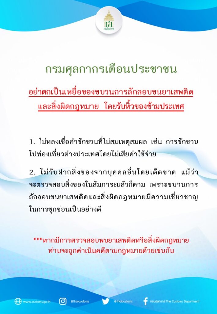 กรมศุลกากรจึงขอเตือนประชาชน อย่าตกเป็นเหยื่อของขบวนการลักลอบขนยาเสพติดและสิ่งผิดกฎหมาย