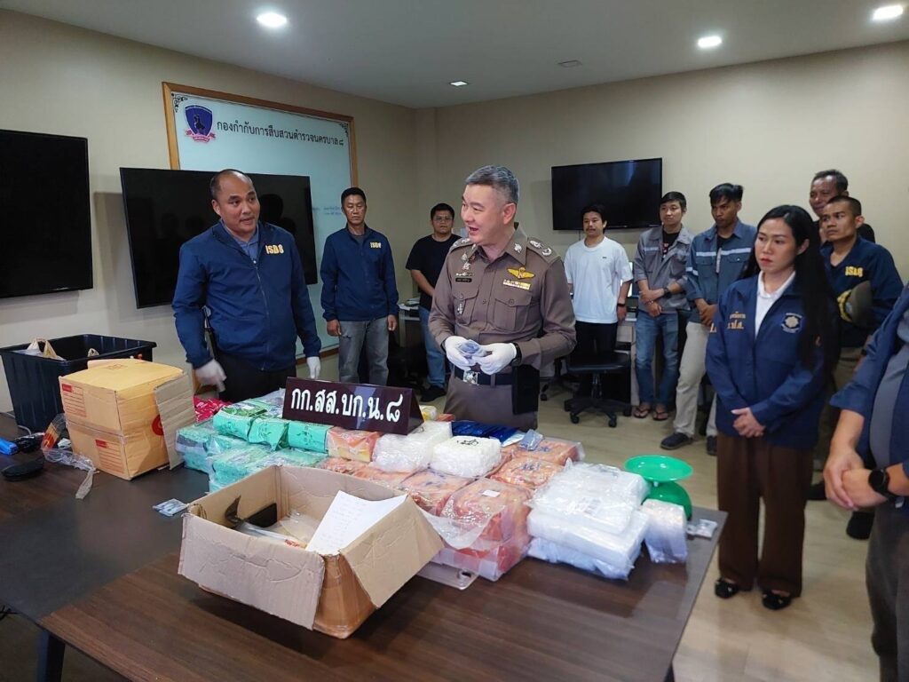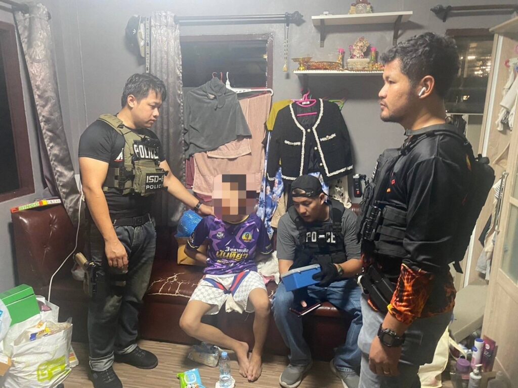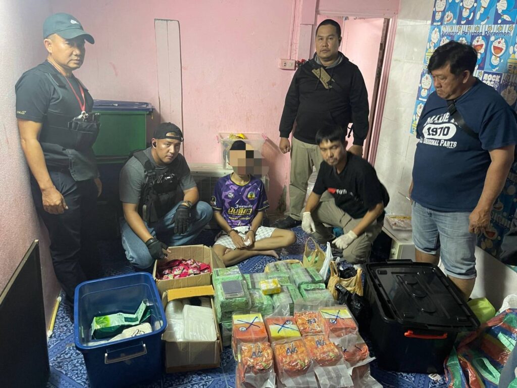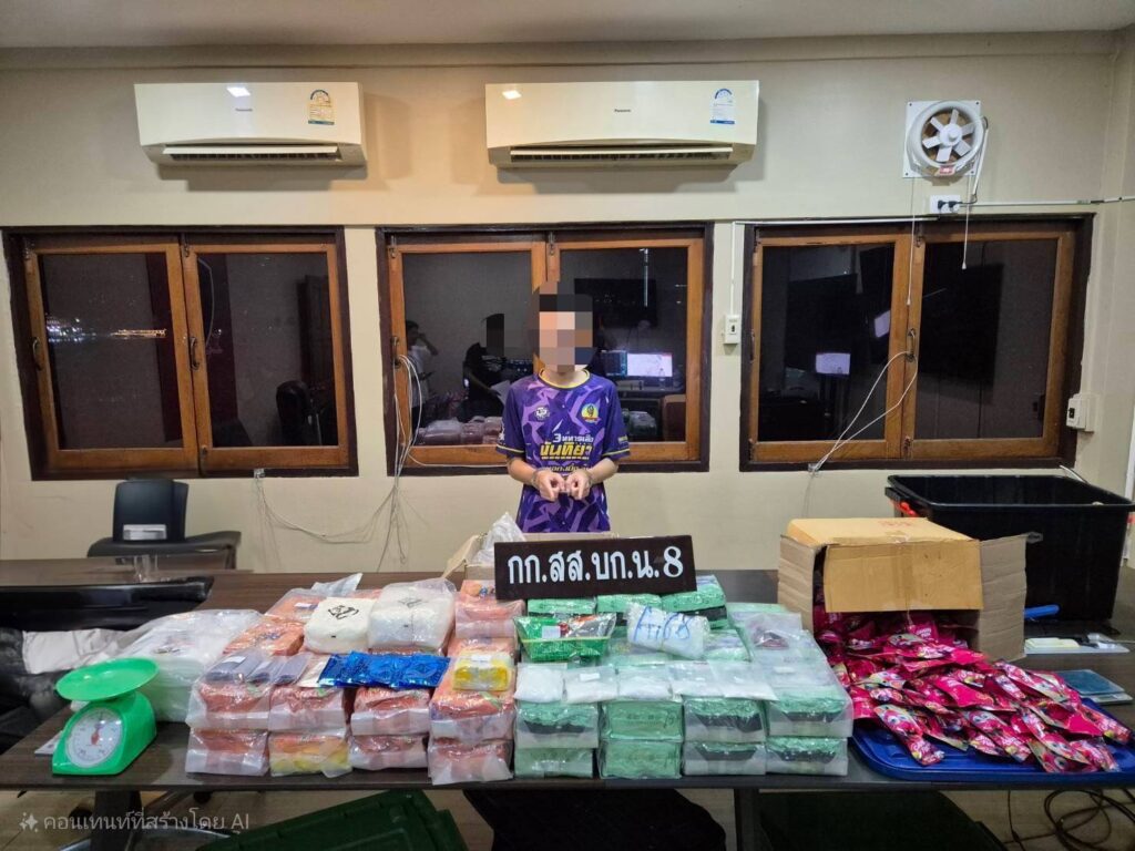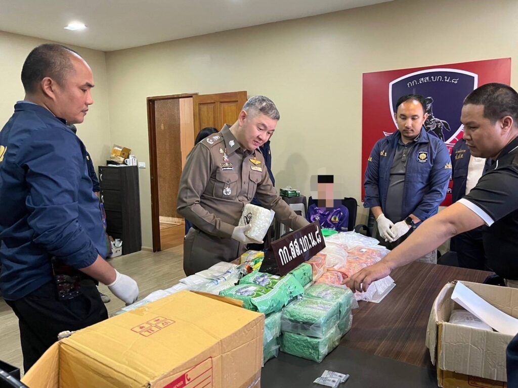 ต่อมาจึงได้สืบสวนติดตามพฤติกรรมเรื่อยมาจนเชื่อได้ว่ากลุ่มดังกล่าวใช้รถยนต์ไปรับยาเสพติดและนำมาซุกซ่อนภายในห้องเช่าไม่มีเลขที่ดังกล่าวจริง จึงได้นำกำลังเจ้าหน้าที่ตำรวจชุด กก.สส.บก.น.8 ไปทำการตรวจค้นห้องเช่าดังกล่าว เมื่อวันที่ 6 พ.ย.2567 เวลาประมาณ 23.35 น. ที่ผ่านมา พบผู้ต้องหาจำนวน 1 ราย คือนายภัทรพงศ์ หรือเวฟ สงวนนามสกุล อายุ 21 ปี ขณะกำลังจัดยาเสพติดใส่กระเป๋าเพื่อนำส่งให้ลูกค้า และได้ทำการตรวจค้นภายในห้องเช่าที่เกิดเหตุ พร้อมด้วยของกลาง พบยาไอซ์ ยี่ห้อใหม่สิงโตสวมมงกุฎ จำนวน 58.8 กิโลกรัม ยาบ้า จำนวน 2,000 เม็ด ยาอี จำนวน 400 เม็ด ลูกอม Candy fun จำนวน 127 แท่ง จากการทำมาแล้วเป็นไม่ต่ำกว่า 1 ปี รายได้รับของกระจายของรายได้ครั้งละ 40,000 – 50,000 บาท