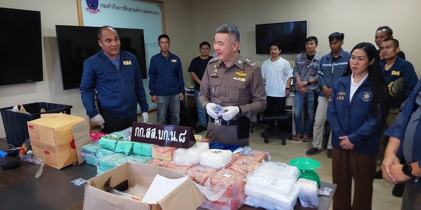 เมื่อเวลา 21.00 น. วันที่ 8 พ.ย. พล.ต.ต.ภานพ วรธนัชชากุล ผบก.น.8 พ.ต.อ.โชติช่วง รัศมี ผกก.สส.บก.น.8 พ.ต.ท.ธวัชชัย อินทะเสย์ รอง ผกก.สส.บก.น.8 พ.ต.ท.อชิรเวชชย์ สุพรรณเภสัช รอง ผกก.สส.บก.น.8 พ.ต.ท.นัทธพงศ์ แก้วอยู่ สว.กก.สส.บก.น.8 พ.ต.ท.ธวัชชัย แจ่มวิถีเลิศ สว.กก.สส.บก.8 พร้อมกำลังเจ้าหน้าที่ตำรวจ กก.สส.บก.น.8 ร่วมกันจับกุมนายภัทรพงศ์ หรือเวฟ สงวนนามสกุล อายุ 21 ปี พร้อมของกลาง พร้อมด้วยของกลาง พบยาไอซ์ยี่ห้อชนิดใหม่ สิงโตสวมมงกุฎ จำนวน 58.8 กิโลกรัม ยาบ้า จำนวน 2,000 เม็ด ยาอี จำนวน 400 เม็ด ลูกอม Candy fun จำนวน 127 แท่ง จับกุมได้ภายในห้องเช่าไม่มีเลขที่ (ชุมชนวัดเศวต) ซอยเจริญนคร 25 แขวงบางลำภูล่าง เขตคลองสาน กรุงเทพมหานคร เมื่อวันที่ 6 พ.ย. 2567 เวลาประมาณ 23:35 น. ที่ผ่านมา