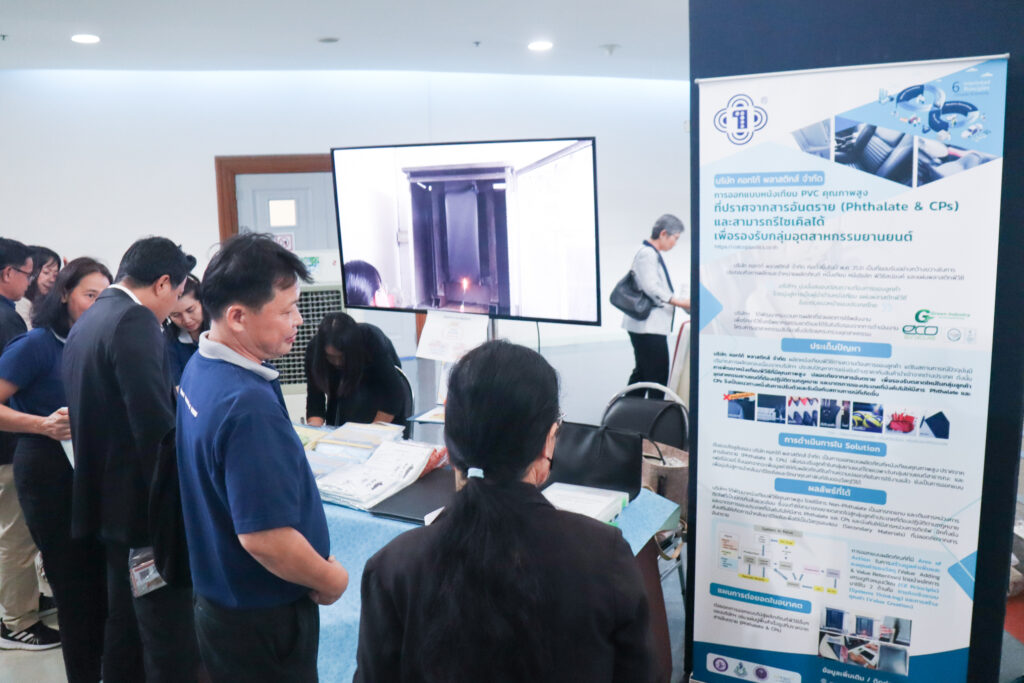 ได้อย่างปลอดภัย ทีมวิจัย เอ็มเทค สวทช. และบริษัทฯ ร่วมกันวิเคราะห์ข้อมูลและประเมินหาโซลูชันที่เหมาะสม ซึ่งนำมาสู่แนวคิดการพัฒนาหนังเทียมพีวีซีสูตรใหม่ที่ไม่ใช้สารอันตรายอย่าง Phthalate และ Chlorinated Paraffins พบว่าการผลิตหนังเทียมสูตรใหม่นี้ ผ่านเกณฑ์การทดสอบการลามไฟ มีสมบัติเชิงกลที่ใกล้เคียงกับสูตรเดิม และไม่แตกต่างกันอย่างมีนัยสำคัญ อย่างไรก็ตาม ผลลัพธ์โดยรวมแสดงให้เห็นว่าสูตรการผลิตใหม่สามารถนำมาใช้ทดแทนสูตรเดิมได้อย่างมีประสิทธิภาพ การพัฒนาการผลิตหนังเทียมที่ปราศจากสารอันตรายนี้ สะท้อนถึงการสร้างคุณค่า (Value Creation) และ การคงคุณค่า (Value Retention) เพื่อนำทรัพยากรหมุนเวียนมาใช้ให้นานที่สุดตั้งแต่ต้นทาง ถือเป็นกลไกสำคัญในการขับเคลื่อนเศรษฐกิจของประเทศไปสู่เศรษฐกิจหมุนเวียนได้สำเร็จอย่างเป็นรูปธรรม ซึ่งสอดคล้องกับนโยบายและทิศทางของการพัฒนาประเทศที่มุ่งสู่ความยั่งยืนโดยทางบริษัทฯ ทั้งนี้ภายในงานยังมีตัวอย่างความสำเร็จของบริษัทที่เข้าร่วมโครงการอีกมากมาย เช่น บริษัท ยูเนี่ยนไพโอเนียร์ จำกัด (มหาชน) บริษัท กรีนสปอต จำกัด และบริษัทอื่นๆ ที่เข้าร่วมโครงการในปีที่ 1 และ 2 เป็นต้น