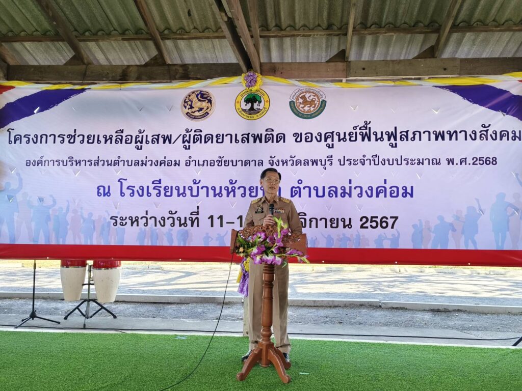 วันที่ 13 พฤศจิกายน 2567 เวลา 14.30 น. ที่โรงเรียนบ้านห้วยนา หมู่ 9 ตำบลม่วงค่อม อำเภอชัยบาดาล จังหวัดลพบุรี นายอำพล อังคภากรณ์กุล ผู้ว่าราชการจังหวัดลพบุรีและผู้อำนวยการศูนย์อำนวยการป้องกันและปราบปรามยาเสพติดจังหวัดลพบุรี เป็นประธานในพิธีเปิดโครงการช่วยเหลือผู้เสพ/ผู้ติดยาเสพติดของศูนย์ฟื้นฟูสภาพทางสังคมในจังหวัดลพบุรีสาขาองค์การบริหารส่วนตำบลม่วงค่อม โดยมีนายกองตรี ภาณุพงศ์ ศิริ นายอำเภอชัยบาดาล พร้อมด้วยส่วนราชการในพื้นและหน่วยงานที่เกี่ยวข้องเข้าร่วม