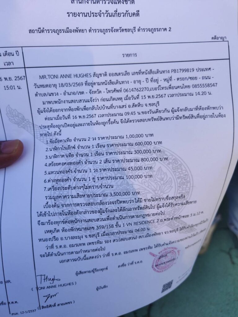 16 พฤศจิกายน 2567 – เวลา 12.00 น. ร.ต.ท.อมรเทพ เพชรทิม รอง สว.(สอบสวน) สภ.เมืองพัทยา รับแจ้งเหตุว่ามีคนร้ายบุกเข้าไปลักทรัพย์สิน นักธุรกิจชาวต่างชาติ ภายในคอนโดมิเนียมแห่งหนึ่ง ซอย 5 พระตำหนัก พัทยาใต้ จ.ชลบุรี จึงรายงานให้ผู้บังคับบัญขาทราบ ก่อนประสานชุดสืบสวน ตำรวจท่องเที่ยว และศูนย์พิสูจน์หลักฐานเขต2 ชลบุรี ลงพื้นที่ตรวจสอบ