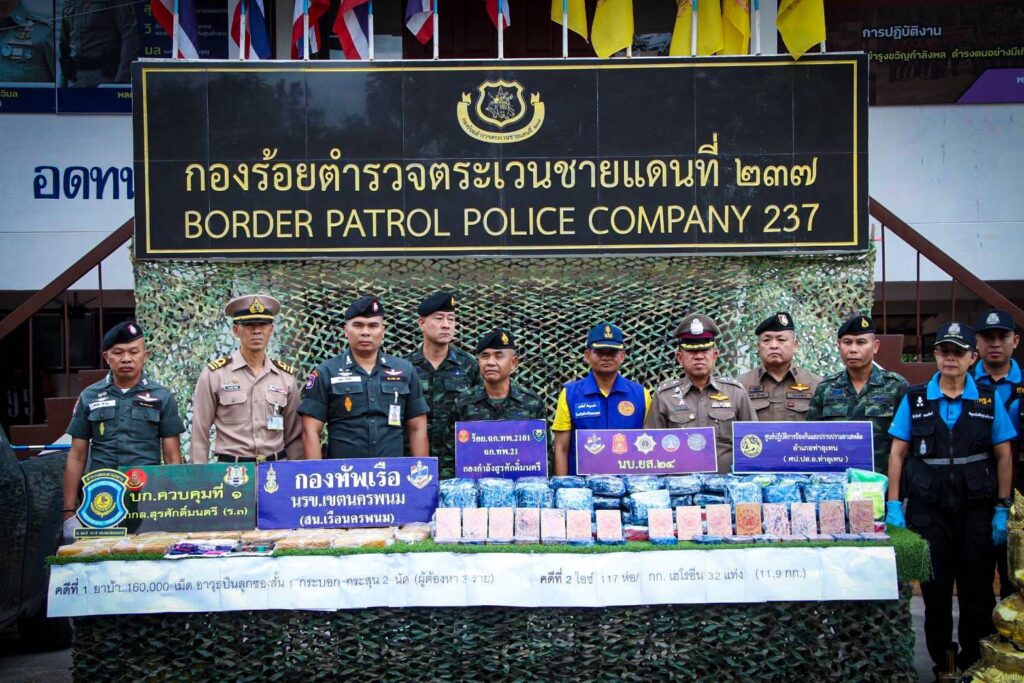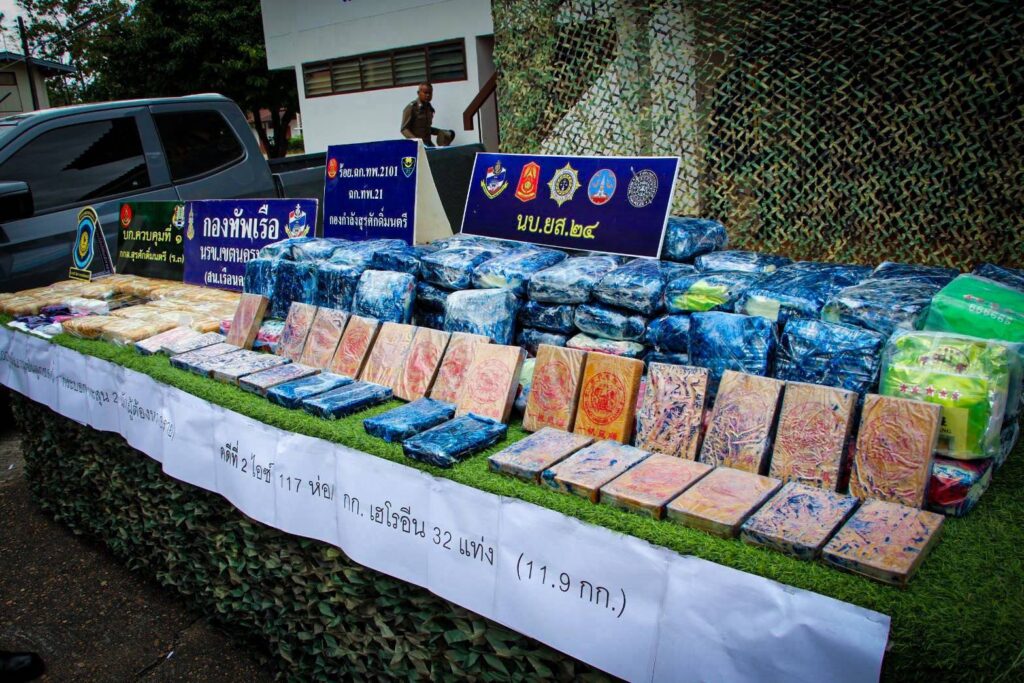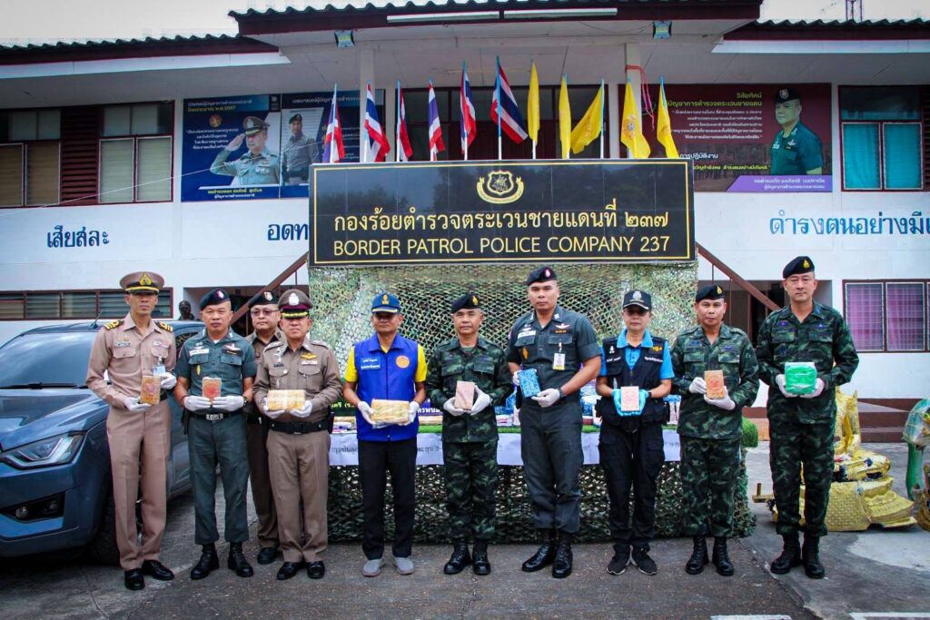 เมื่อวันที่ 18 พ.ย.67 เวลา 10.00 น. ที่กองร้อยเฉพาะกิจตำรวจตระเวนชายแดนที่ 237 อ.ท่าอุเทน จ.นครพนม พล.ต.ฉัฐชัย มีชั้นช่วง รอง ผบ.นบ.ยส.24 (2)/ผบ.มทบ.210, พ.อ.กัญญนัต ไชโอชะ รอง ผอ.ส่วนอำนวยการ นบ.ยส.24 (2),พ.อ.ศรณณัฐ นวยมณี รอง ผบ.บก.ควบคุมที่ 1(ร.3)กองกำลังสุรศักดิ์มนตรี / รองผอ.ส่วนอำนวยการ นบ.ยส.24 (5) นายสุรศักดิ์ กันสูงเนิน ป้องกันจังหวัดนครพนม,พ.ต.อ.วุทธยา สิงห์กิ้ง ผกก.ตดช.23, พ.ต.อ.หญิง จีระนันท์ ธนะสิงห์ ผกก.พฐ.นครพนม,พ.ต.ท.สมพล ห้าวหนู รอง ผกก.ตชด.23 พร้อมด้วย พ.ต.ท.เรวัฒ จำปาน ผู้บังคับกองร้อยตำรวจตระเวนชายแดนที่ 237 และชุดปราบปรามยาเสพติดฯ พร้อมหน่วยงานความมั่นคงในพื้นที่ ร่วมแถลงข่าวตรวจยึดเฮโรอีน 32 แท่ง ยาไอซ์ 117 ห่อ/กก.