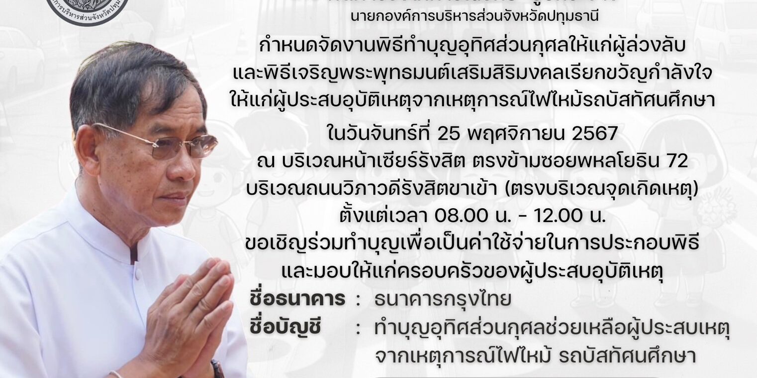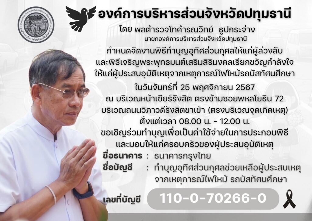 พลตำรวจโท คำรณวิทย์ ธูปกระจ่าง ได้กล่าวเพิ่มว่า ในส่วนของงานวันที่ 25 พฤศจิกายน ที่จะถึงนี้เป็นงานทำบุญให้กับเด็กนักเรียนที่มาประสบอุบัติเหตุรถบัสไฟไหม้ในพื้นที่จังหวัดปทุมธานี ซึ่งเป็นนักเรียนจังหวัดอุทัยธานีโดยมีเด็กนักเรียน 20 คน และครู 3 คนเสียชีวิต เป็นอุบัติเหตุที่ร้ายแรง พี่น้องประชาชนชาวปทุมธานีมีเสียงสะท้อนมีความประสงค์ที่ต้องการทำบุญให้ผู้เสียชีวิตทั้ง 23 คนตามประเพณีเพื่อส่งวิญญาณเขาไปเกิดในภพภูมิที่ดี ได้หารือกับพระอาจารย์เทียนชัย วัดเทพสรธรรมาราม ท่านดูแล้วก็กำหนดมาเลยว่าวันที่ 25 ให้เรานิมนต์พระ 23 รูป ตามจำนวนผู้เสียชีวิต และเครื่องสังฆทานจะมีความแตกต่างกันที่เคยทำกัน เป็นสังฆทานของเด็กผู้หญิงเด็กผู้ชายและผู้ใหญ่ 3 คน อยู่ที่ความเชื่อของแต่ละคน แต่พี่น้องชาวคูคต ชาวนครรังสิต โดยเฉพาะกลุ่มพ่อค้าแม่ค้าที่อยู่ในตลาดสี่มุมเมืองที่ต้องเดินทางในช่วงดึกเพื่อเตรียมการค้าขายเพราะเป็นตลาดส่งที่ใหญ่ ได้มีการมาพูดมาขอร้องให้ทำพิธี เพราะเขาเจอเหตุการณ์บางอย่าง เช่นมีเด็กมานั่งร้องไห้บ้าง มีเด็กวิ่งตัดหน้ารถบ้าง อบจ.เราจึงจำเป็นต้องทำ ส่วนที่พี่น้องประชาชนจะร่วมทำบุญ ช่วยบริจาคเพื่อทำบุญในวันนั้น ก็สามารถทำได้ตามเลขบัญชีที่เปิดขึ้นเฉพาะกิจคือ ชื่อบัญชี ทำบุญอุทิศส่วนกุศลช่วยเหลือผู้ประสบเหตุจากเฟตุการณืไฟไหม้ รถบัสทัศนศึกษา ธนาคารกรุงไทย เลขบัญชี 110-0-70266-0 หากเงินเหลือจะส่งมอบให้ทาง จ.อุทัยธานีไป และในวันนั้นท่านอนุทิน ชาญวีรกูล รองนายกรัฐมนตรี และรัฐมนตรีว่าการกระทรวงมหาดไทย ปลัดกระทรวงมหาดไทย ท่านผู้ว่าราชการจังหวัดอุทัยธานี ท่านชาดา ไทยเศรษฐ์ และท่านผู้ว่าราชการจังหวัดปทุมธานีท่านก็จะมาร่วมในวันดังกล่าวด้วย ร่วมทำพิธีให้กับผู้เสียชีวิต ซึ่งในปทุมธานีเราไม่เคยเจอเหตุการณ์แบบนี้มาก่อน.