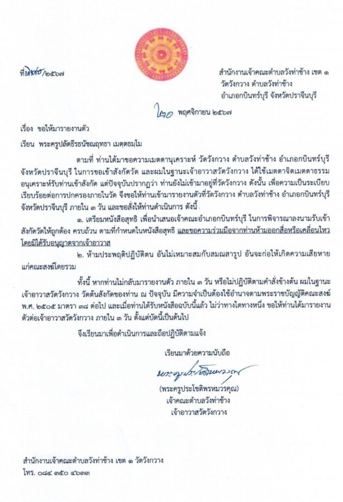 ต่อมาได้ปรากฏหนังสือ ที่พิเศษ/2567 จาก เจ้าคณะตำบลท่าช้าง เขต 1 วัดวังกวาง ตำบลท่าช้าง อำเภอกบินทร์บุรี จังหวัดปราจีนบุรี ลงวันที่ 20 พฤศจิกายน 2567 เรื่องขอให้มารายงานตัว เรียนถึง พระครูปลัดธีรธนัช เมตตฺตธมฺโม โดยแจ้งว่าจากการที่ได้มีการขอเข้าสังกัดวัดวังกวาง แต่ท่านยังไม่เข้ามาที่วัดจึงสั่งการขอให้ดำเนินการ ในการเตรียมหนังสือสุทธิเพื่อแจ้งต่อเจ้าคณะอำเภอกบินทร์บุรีลงนามให้ถูกต้องครบถ้วน และขอความร่วมมือห้ามท่านออกสื่อหรือเคลื่อนไหวโดยไม่ได้รับอนุญาตจากเจ้าหน้าที่ และห้ามปฏิบัติตนอันไม่เหมาะสมกับสมณรูปอันจะก่อให้เกิดความเสียหายแก่คณะ ทั้งนี้ให้มีการกลับมารายงานตัวที่วัดวังกวาง ภายในสามวัน ซึ่งอาศัยอำนาจตาม พระราชบัญญัติ พ.ศ.2505 มาตรา 38 ลงนามโดย พระครูประโชติพรหมวรคุณ เจ้าคณะตำบลวังท่าช้าง เจ้าอาวาสวัดวังกวาง